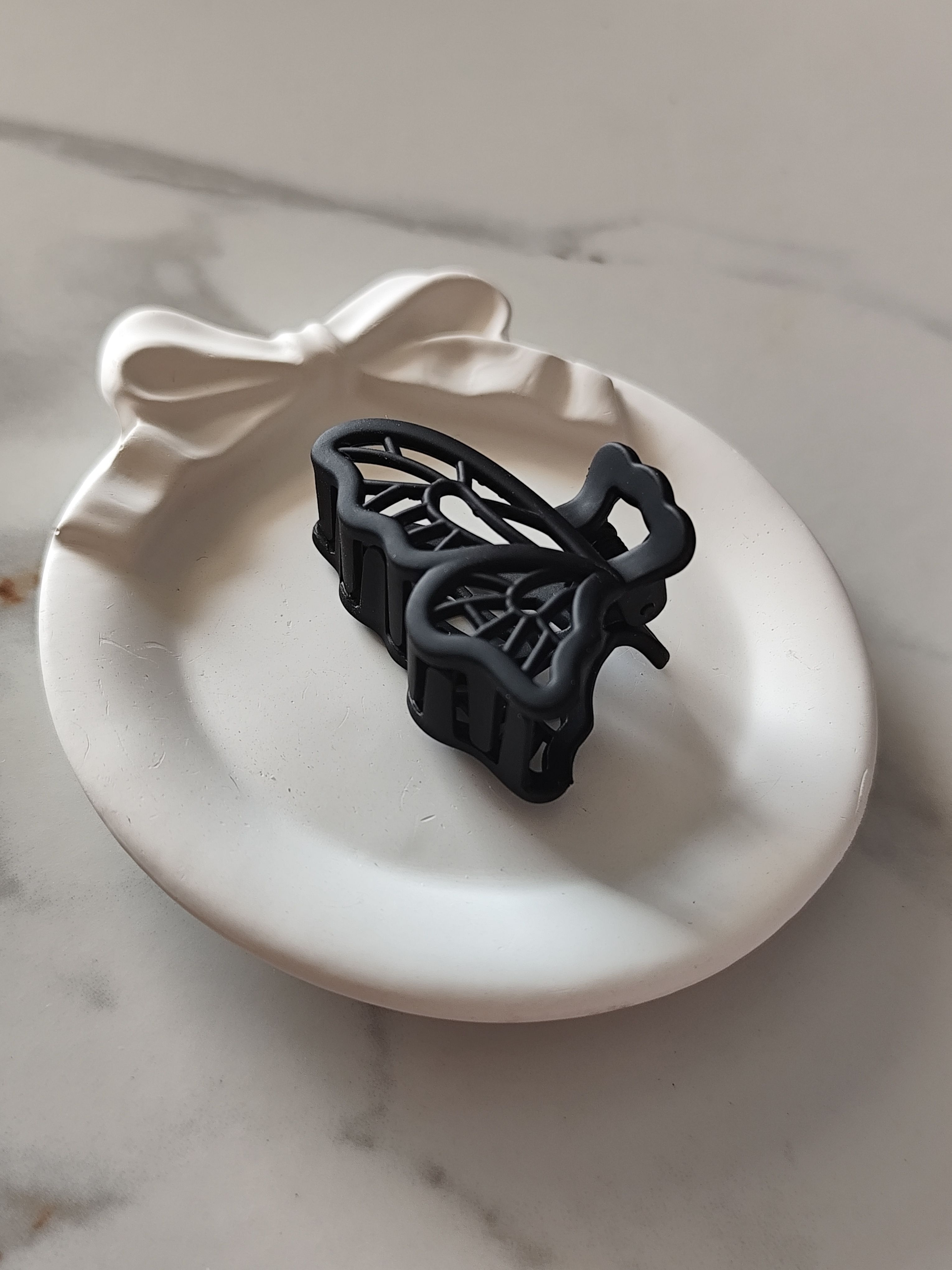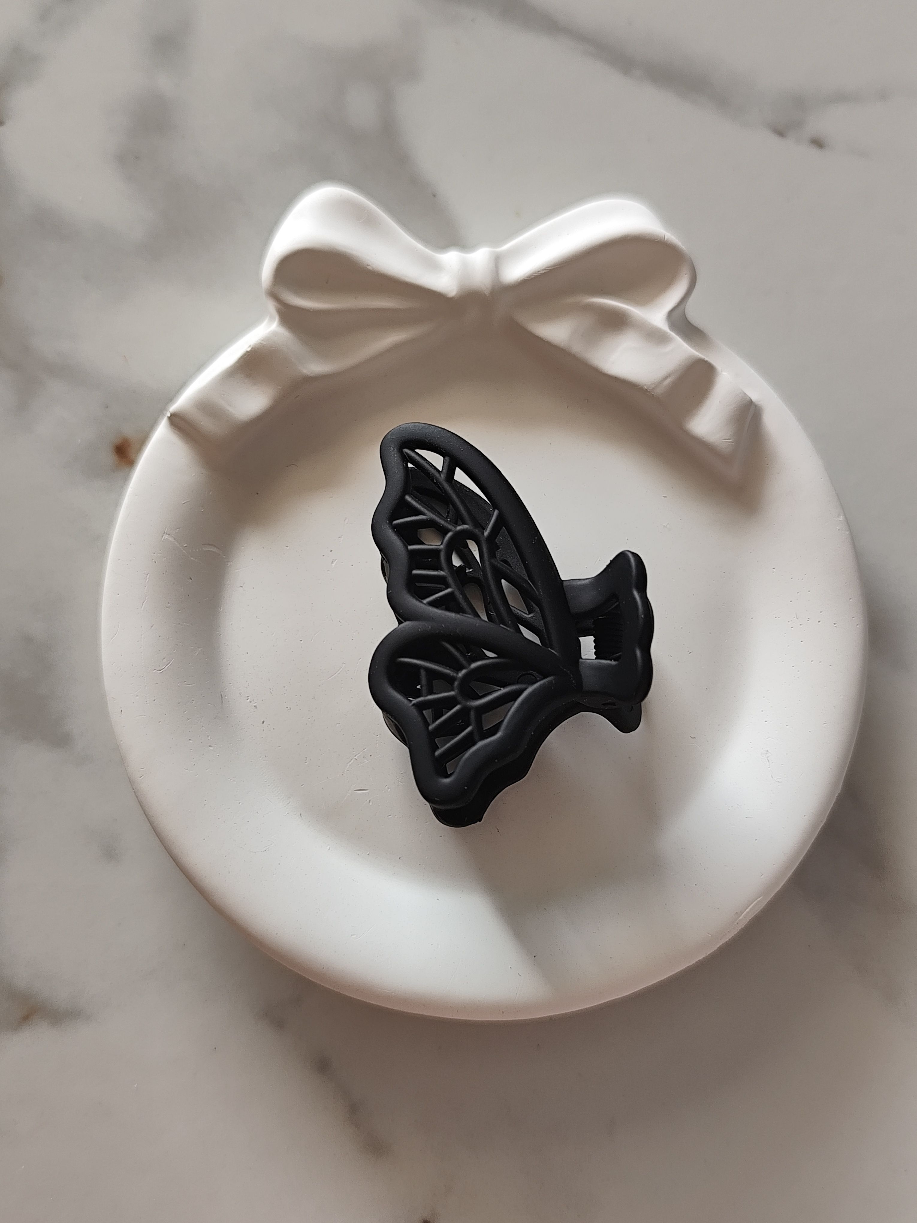 Classic black butterfly claw clip in a matte finish for a timeless look. Small in size and lightweight, perfect for minimal everyday hairstyles and secure front hair styling.