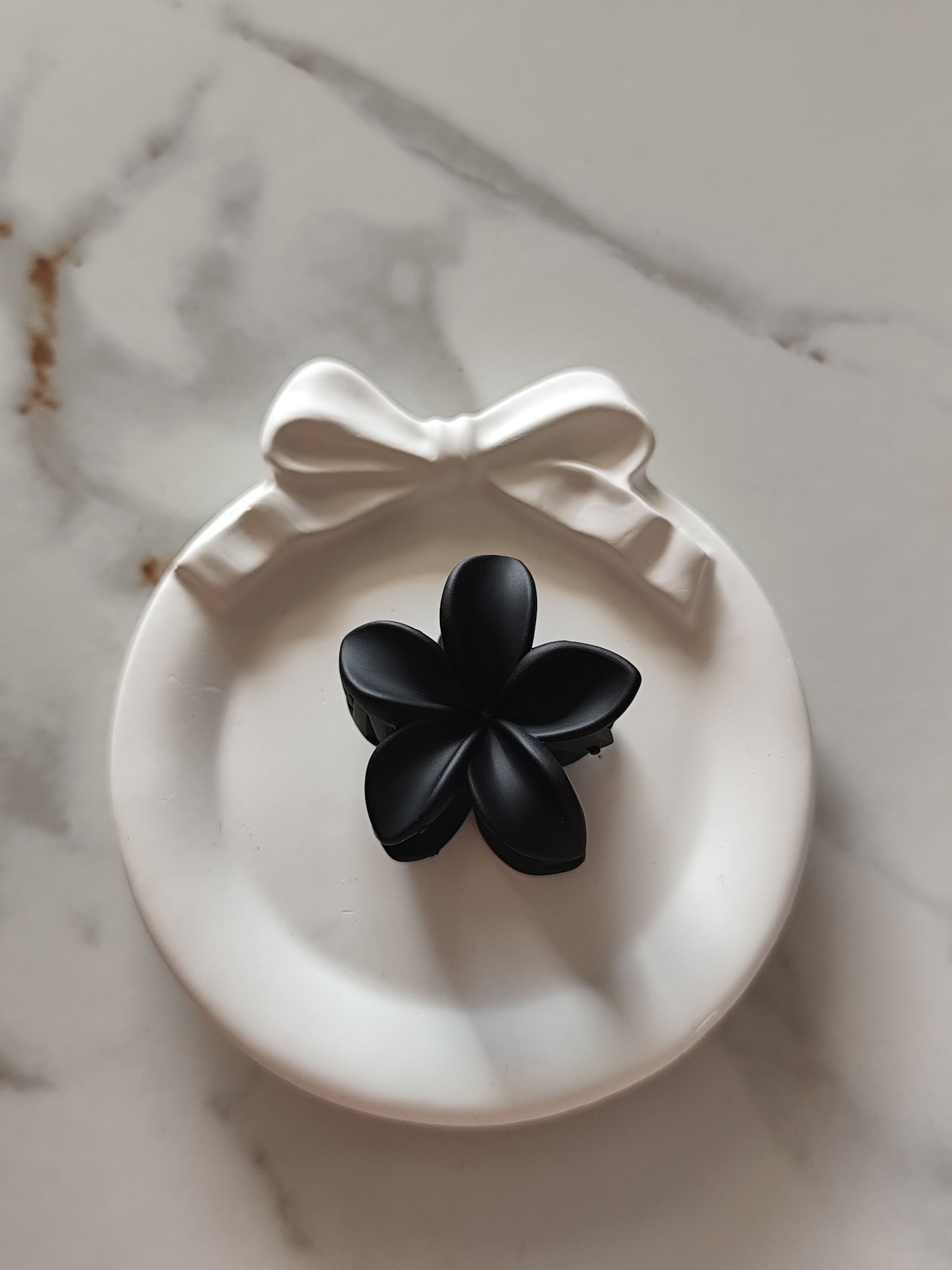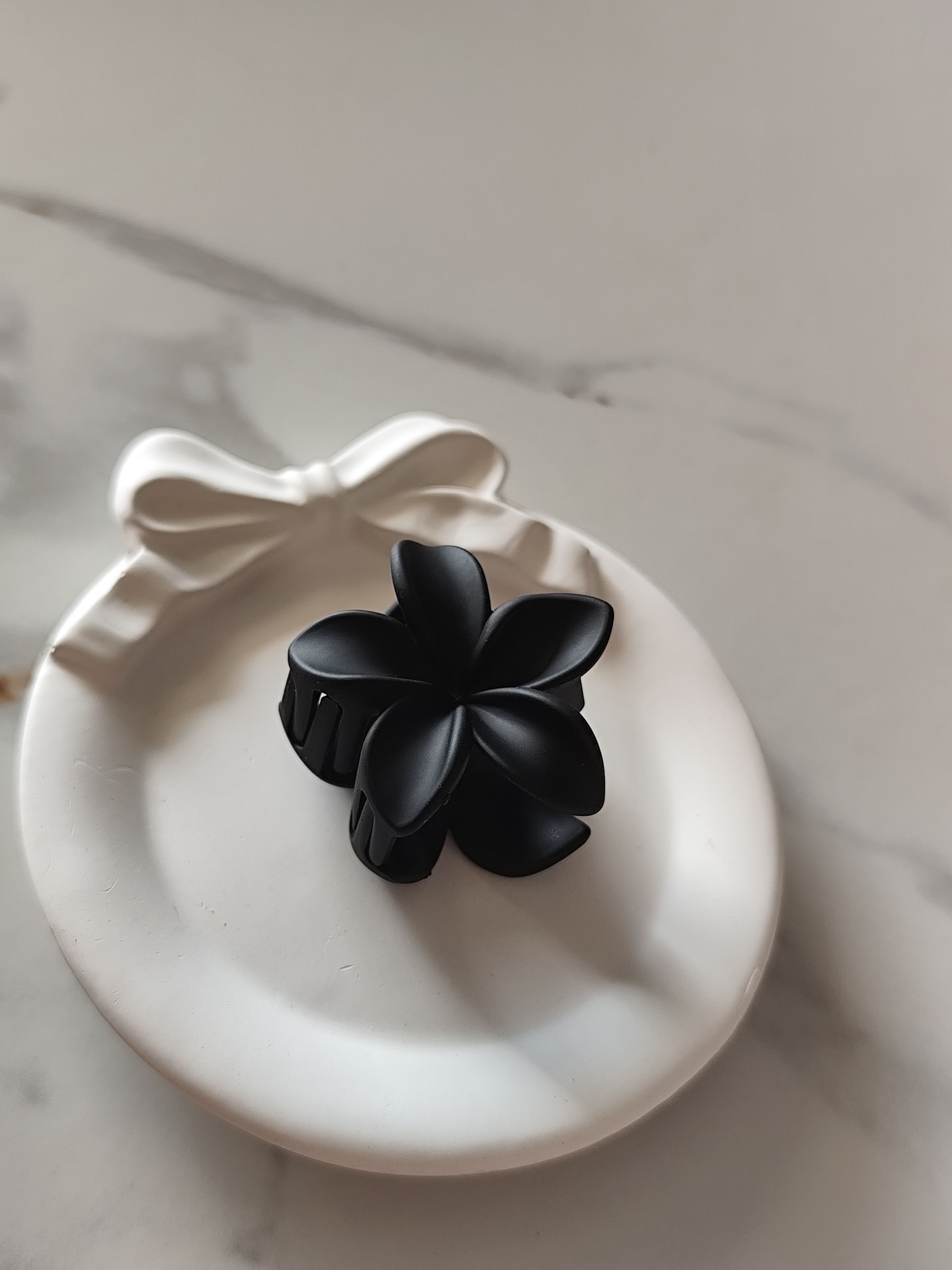 A classic and versatile black flower claw clip designed for effortless everyday styling. The matte finish and floral shape give it a clean, elegant look that pairs well with any outfit—casual or formal.