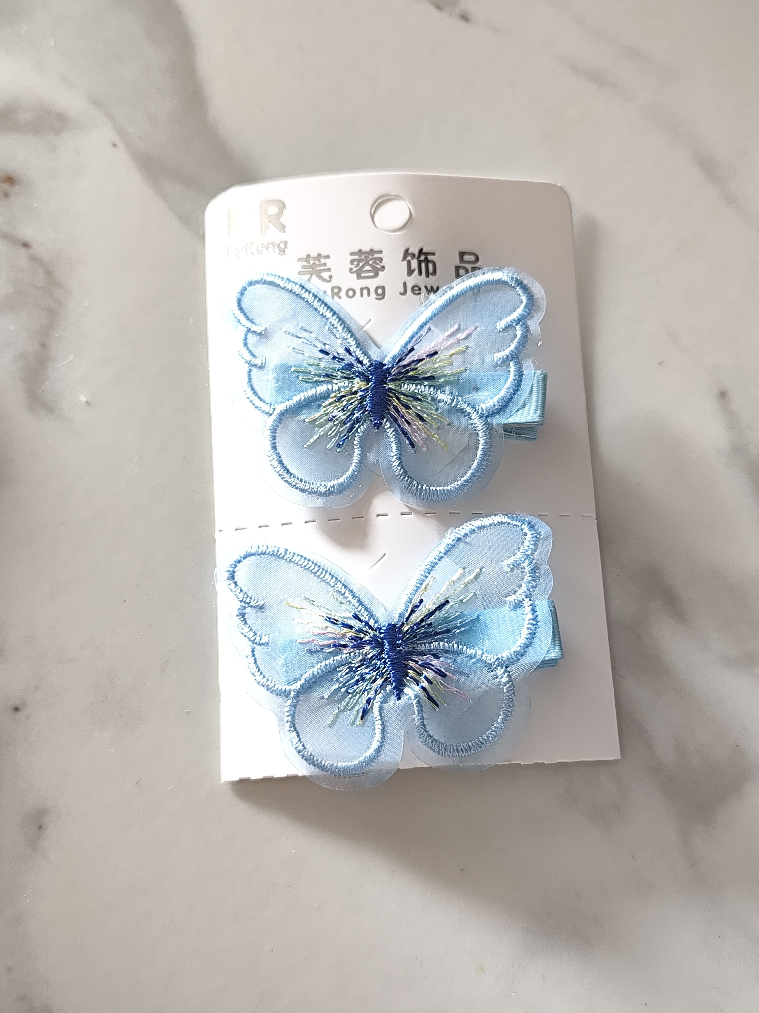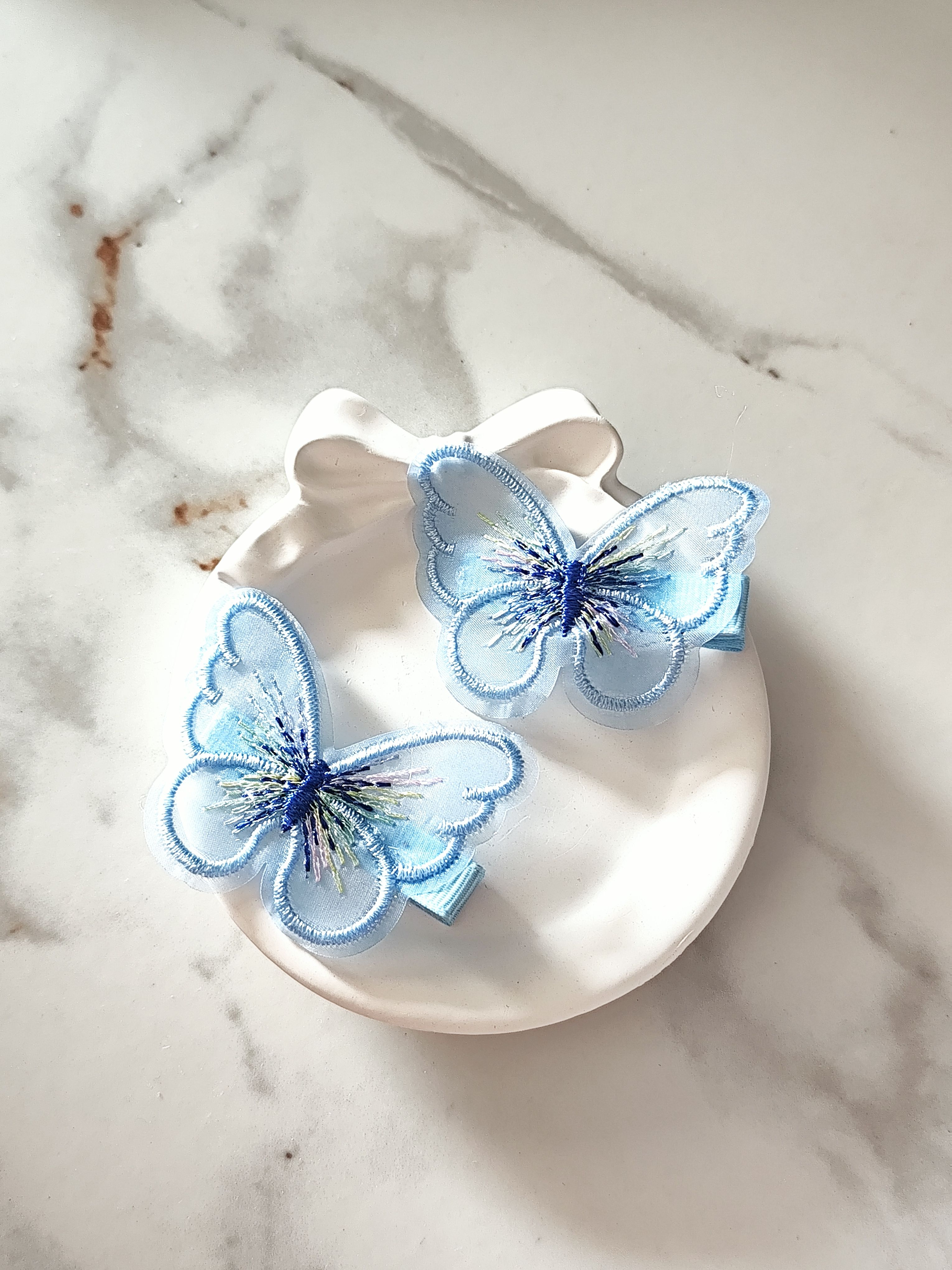 These sky blue butterfly hair pins bring a fresh and charming look to any hairstyle. Made with airy organza fabric and fine embroidery, they are gentle on hair and perfect for daily wear or special occasions