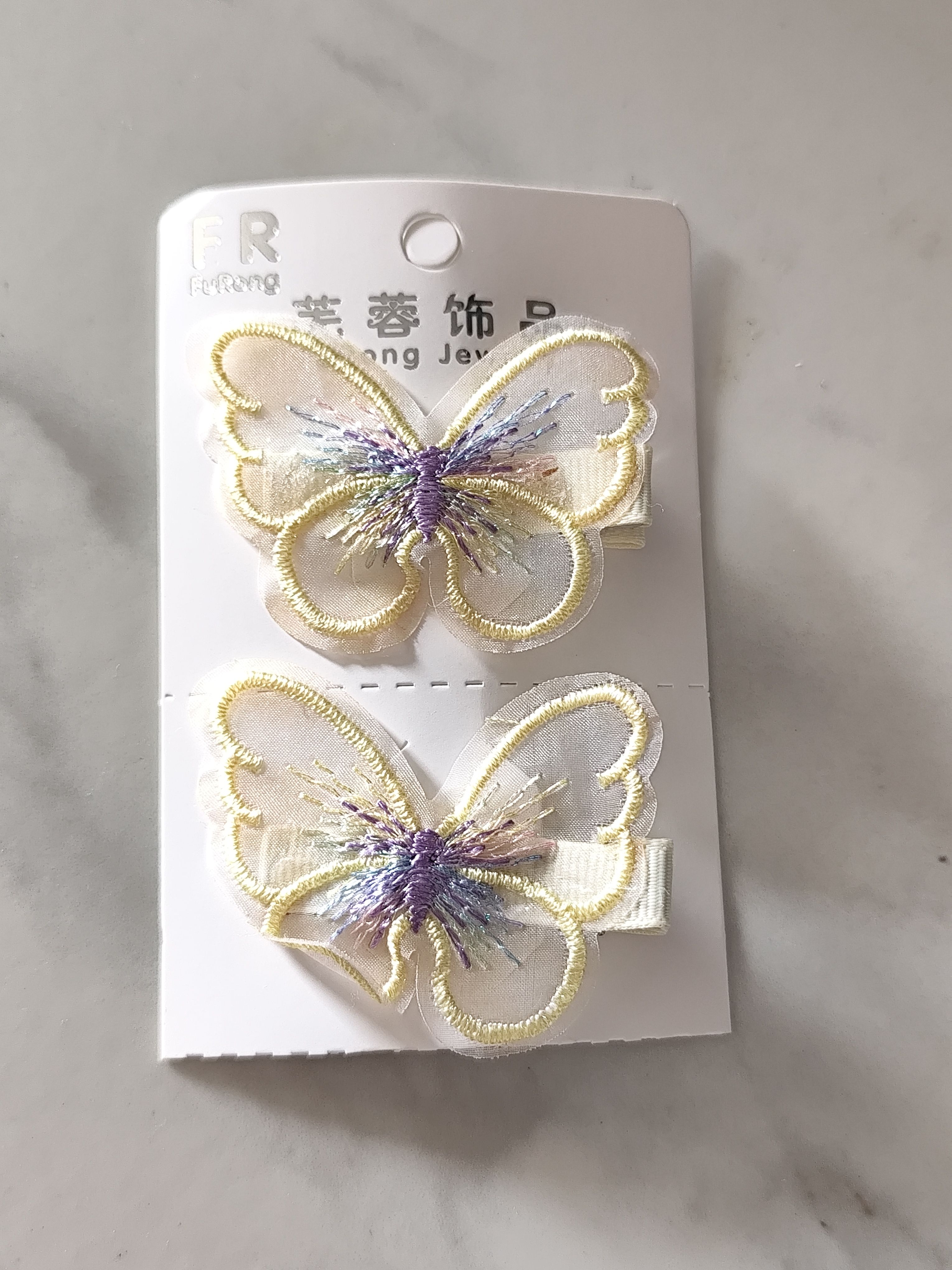 Brighten up your child’s hairstyle with these butter yellow butterfly hair pins. Featuring delicate embroidery on soft organza fabric, these clips add a cheerful and elegant touch while staying comfortable all day. Perfect for festive wear, summer outfits, and celebrations.
