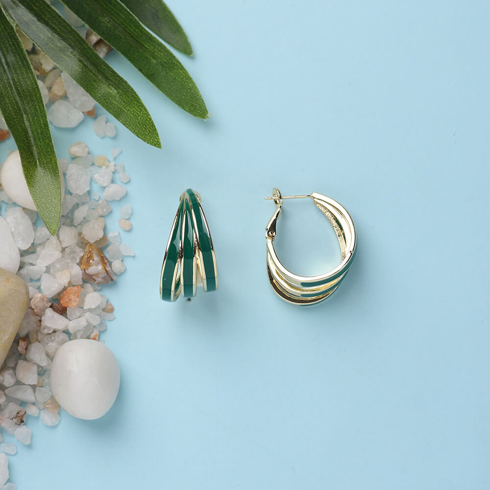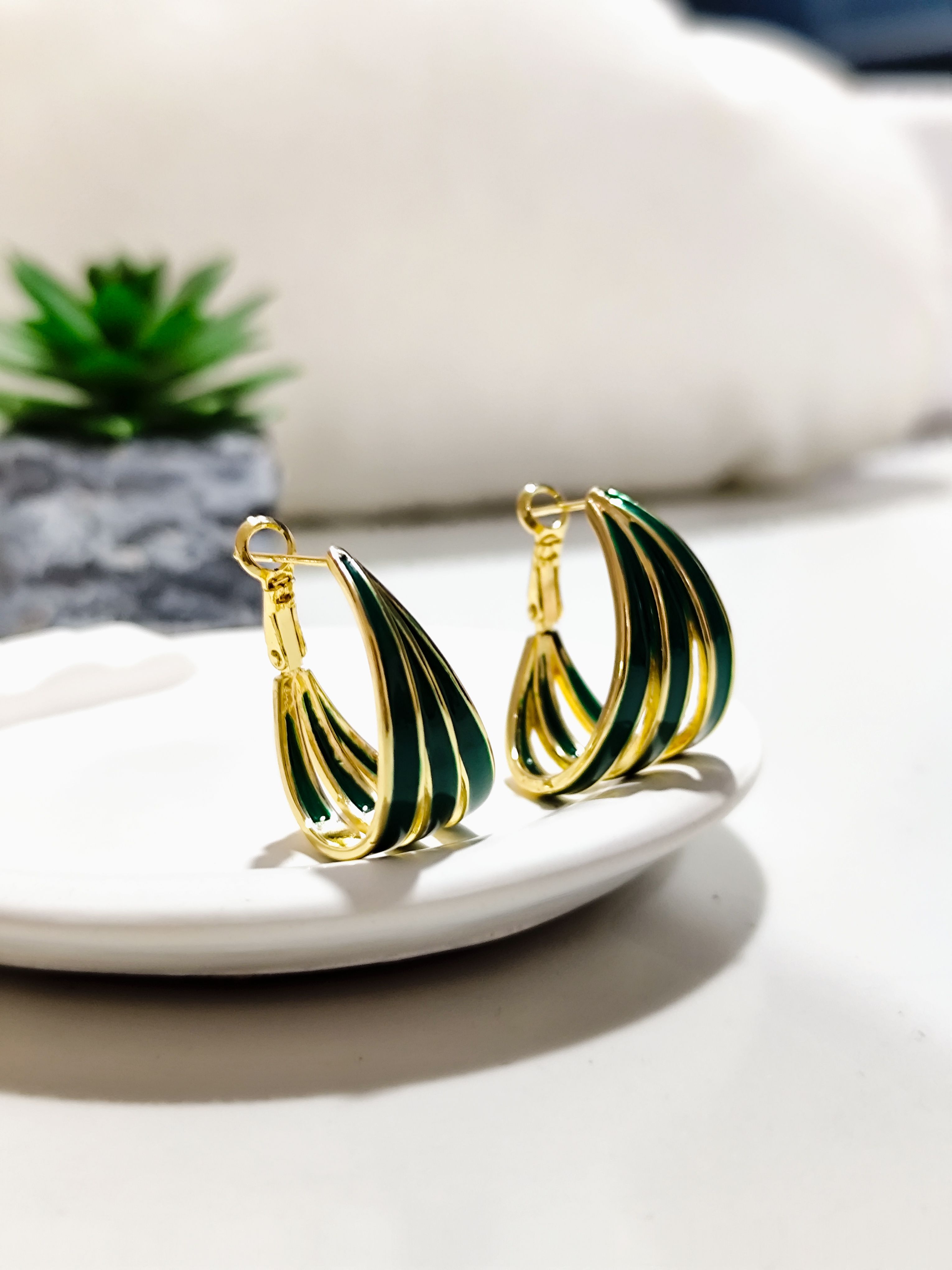These stunning green enamel hoop earrings combine rich colour with a gold-tone finish for a bold yet elegant look. Their curved layered design adds dimension while staying lightweight and comfortable. A statement piece that instantly elevates simple outfits.