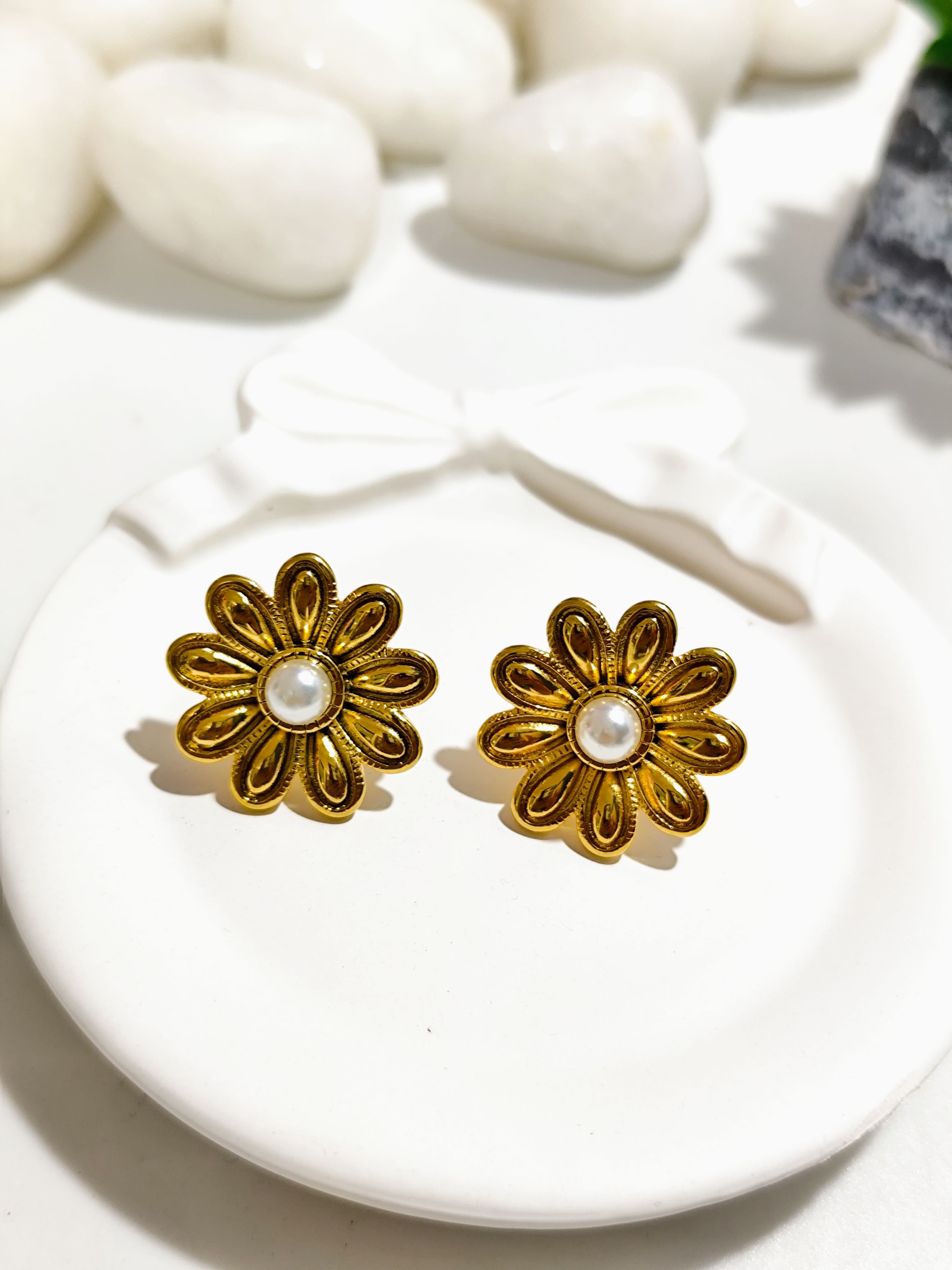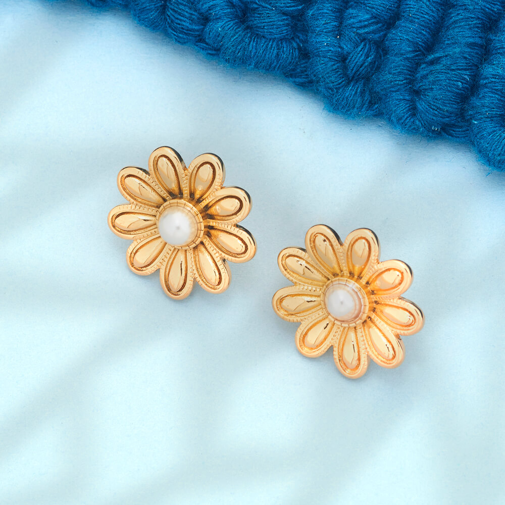Sweet and timeless, these daisy-inspired stud earrings feature a soft pearl centre surrounded by gold petals. A perfect blend of charm and elegance, they’re great for everyday wear. Subtle enough for daily use yet special enough for gifting.