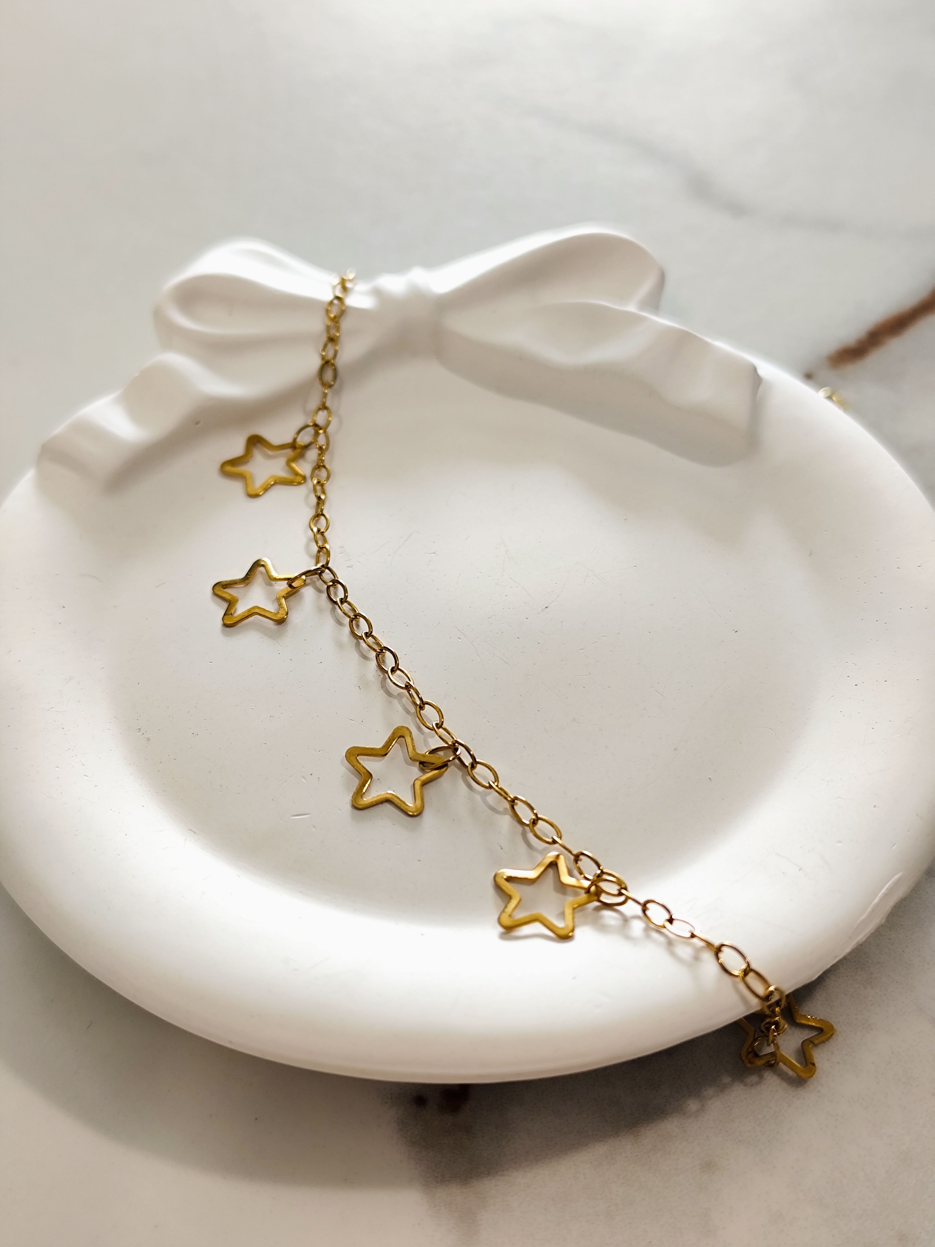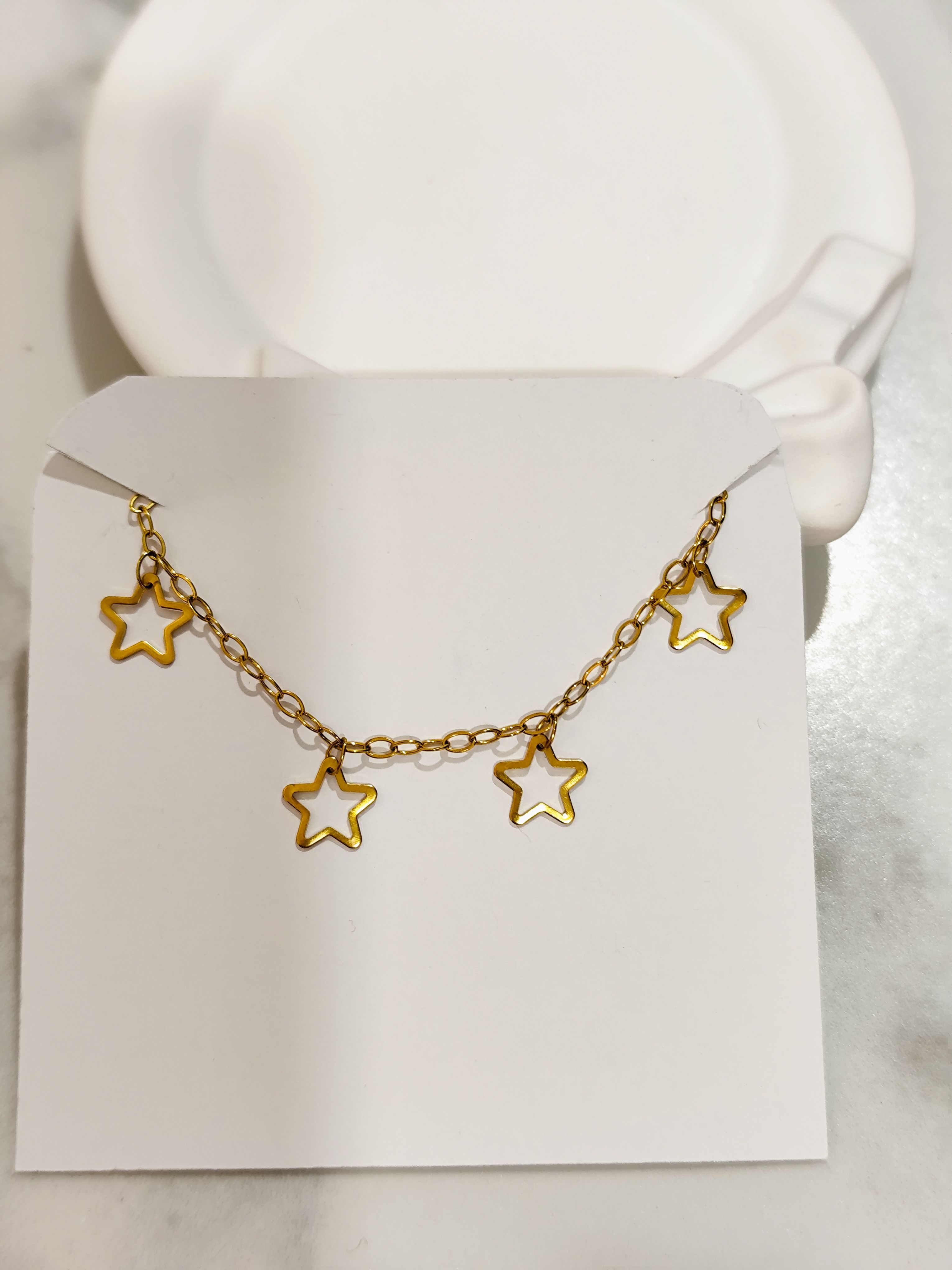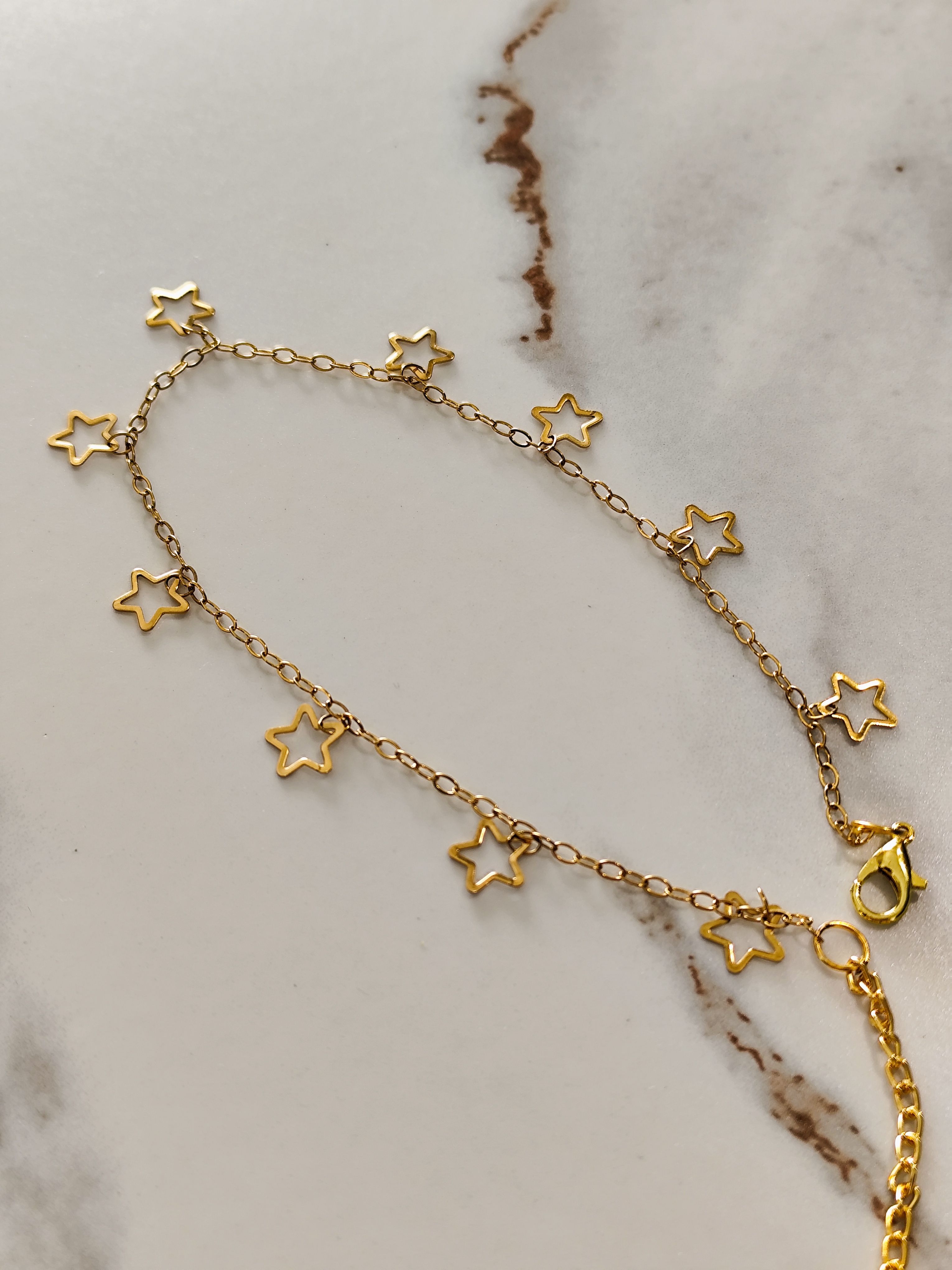 Add a subtle sparkle to your steps with this elegant gold star charm anklet. Designed with delicate star-shaped charms spaced along a fine chain, this anklet brings a playful yet graceful touch to everyday and occasion wear. Lightweight and adjustable, it sits comfortably on the ankle and adds just the right amount of shine without feeling heavy. Perfect for those who love minimal, dainty jewellery with a hint of charm.