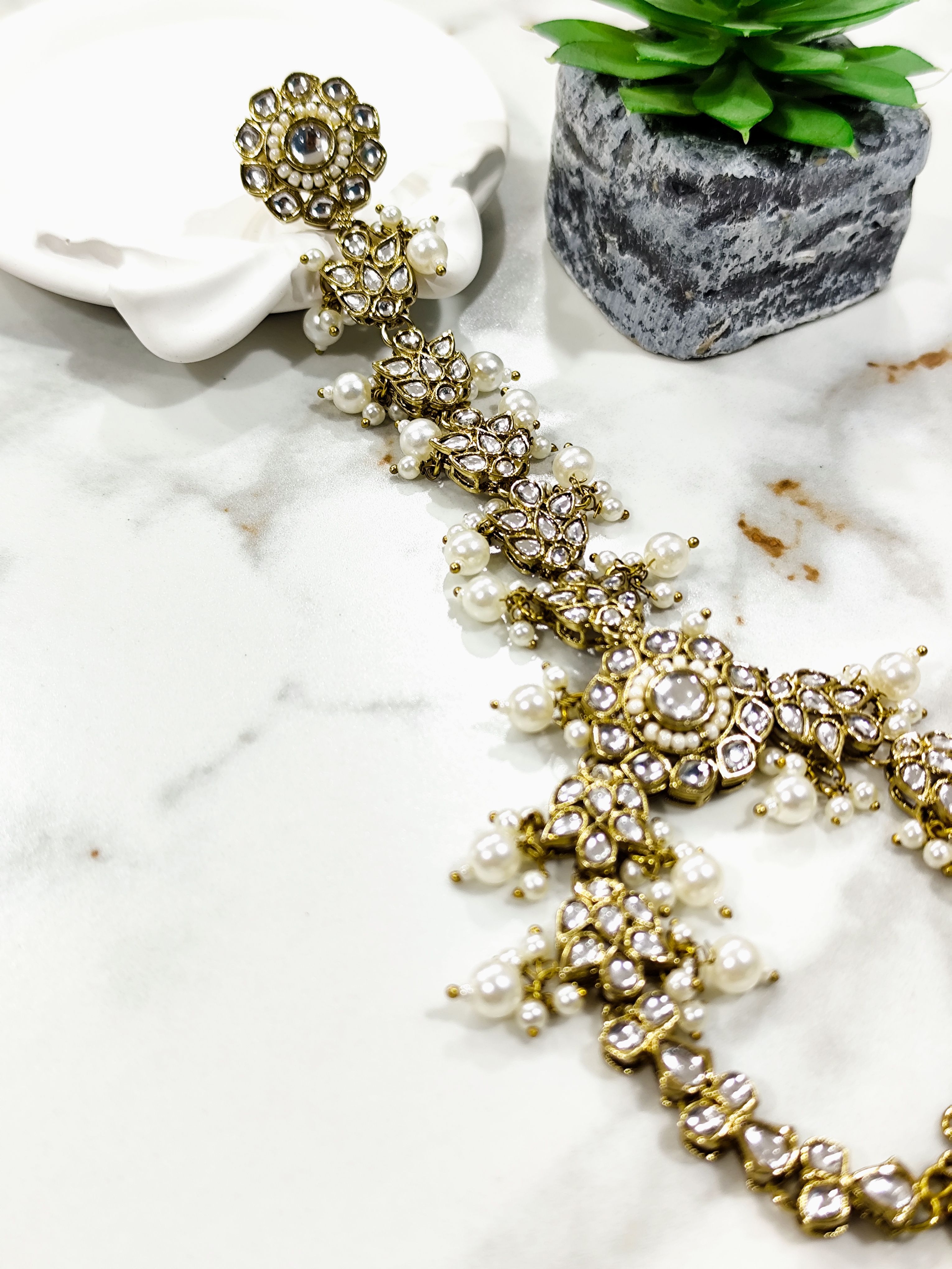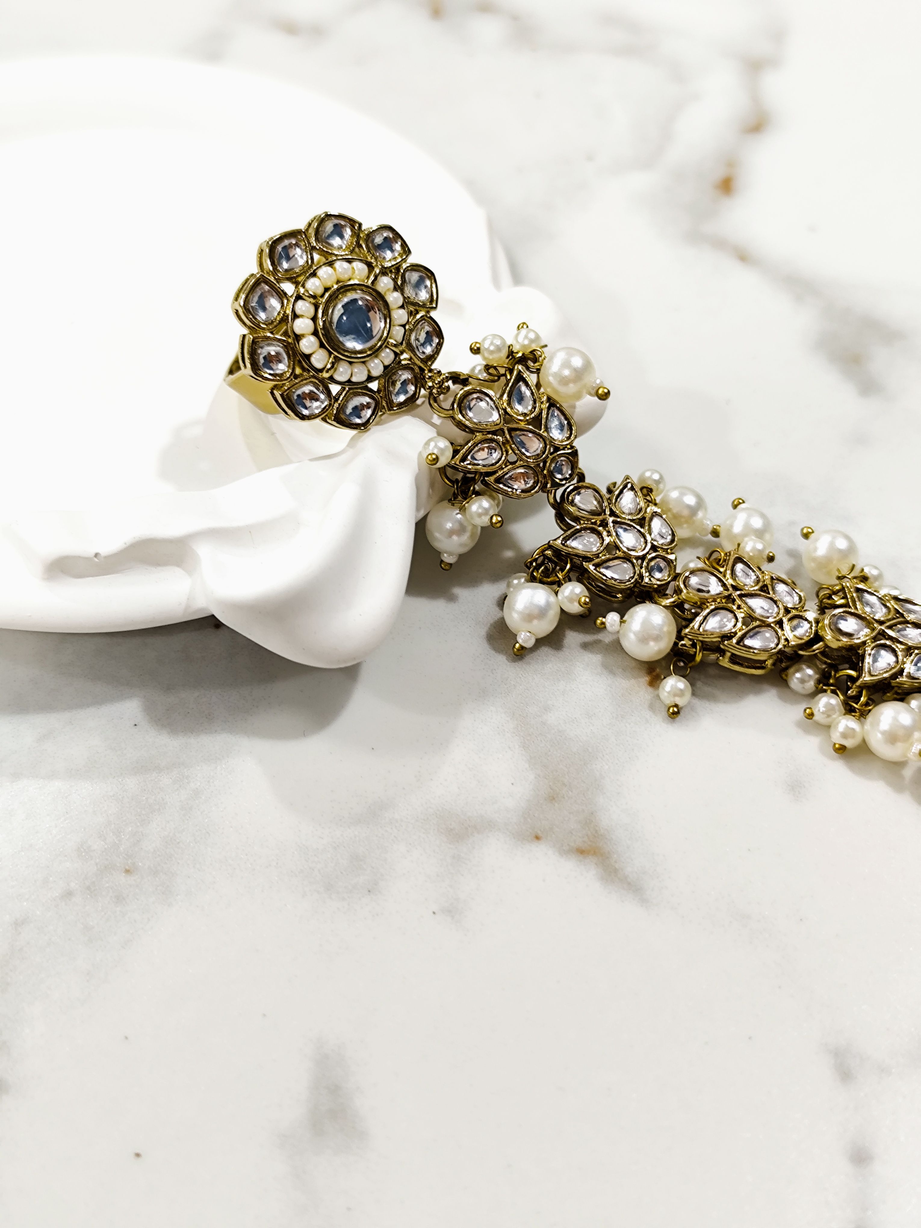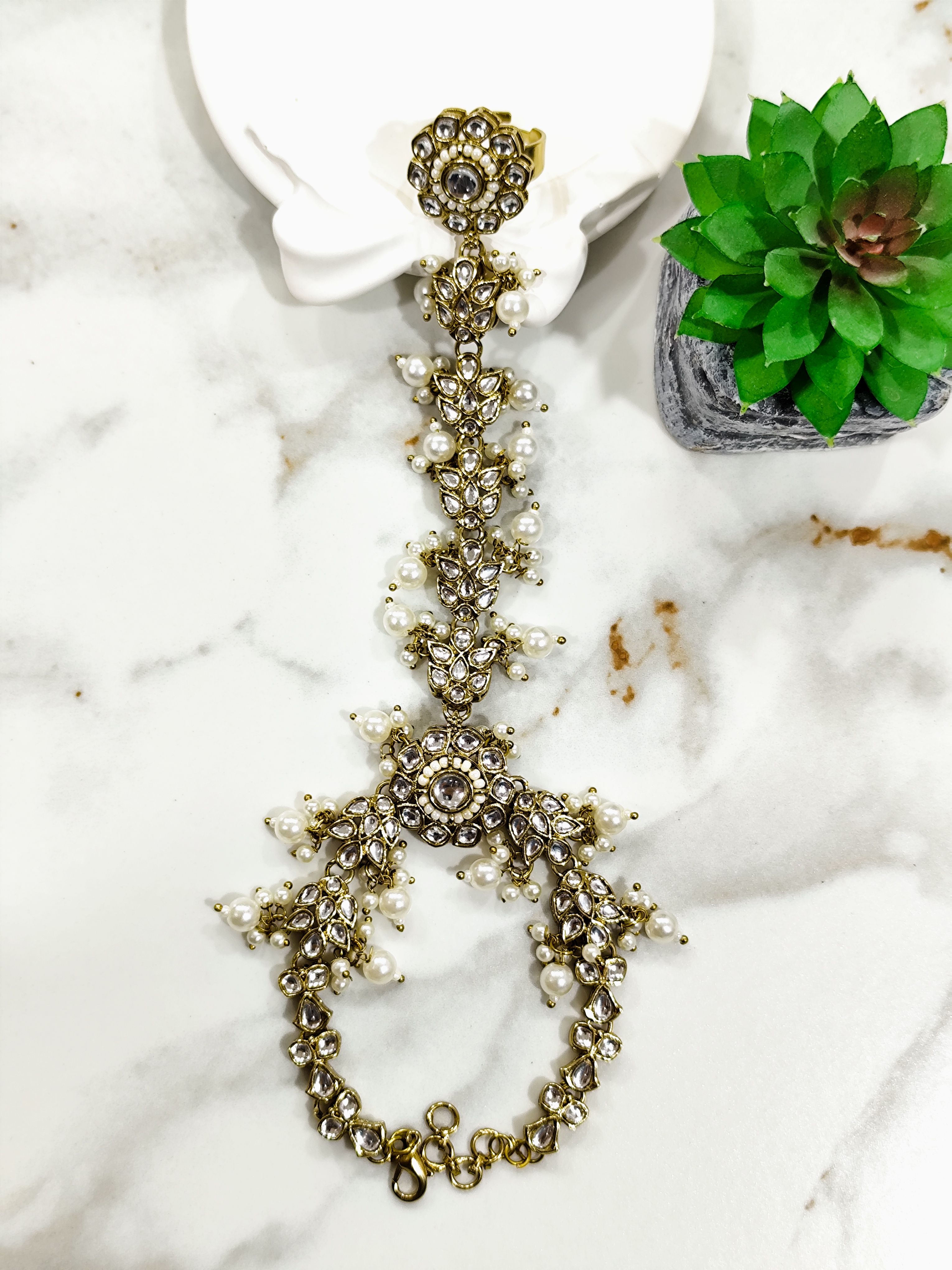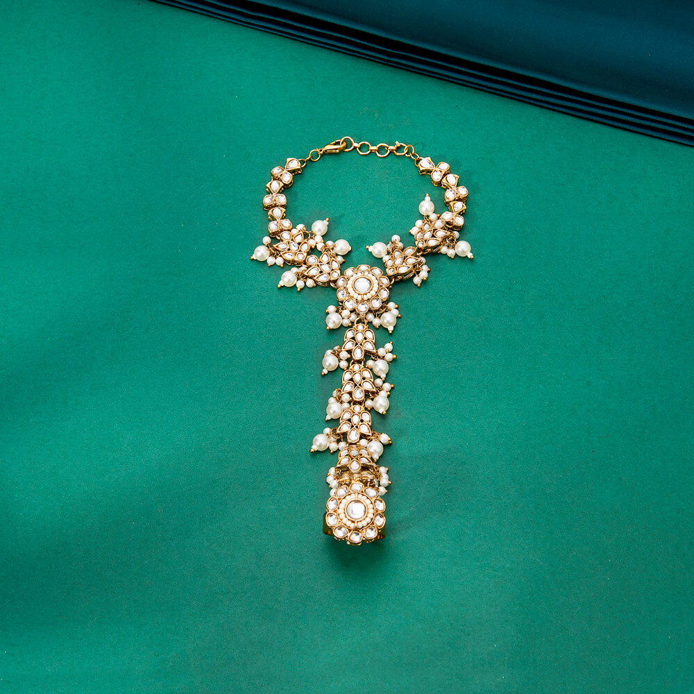 Elevate your festive and bridal looks with this stunning kundan pearl hath phool. Designed with intricate kundan stones, delicate pearl detailing, and a graceful hand-harness structure, this piece connects the ring to the bracelet with an ornate chain for a royal finish. Rich in traditional charm yet lightweight to wear, it’s perfect for weddings, festivals, and special celebrations.