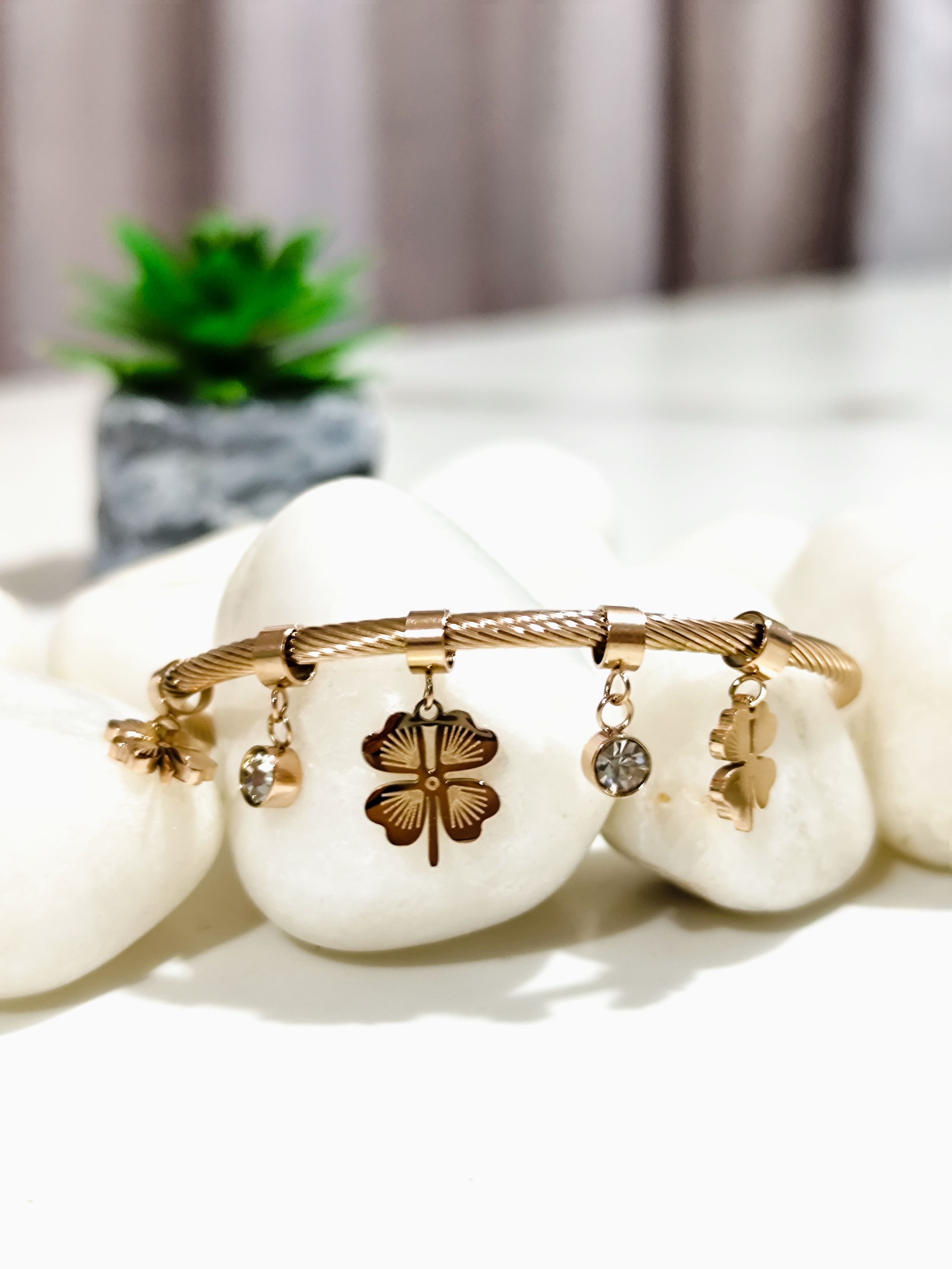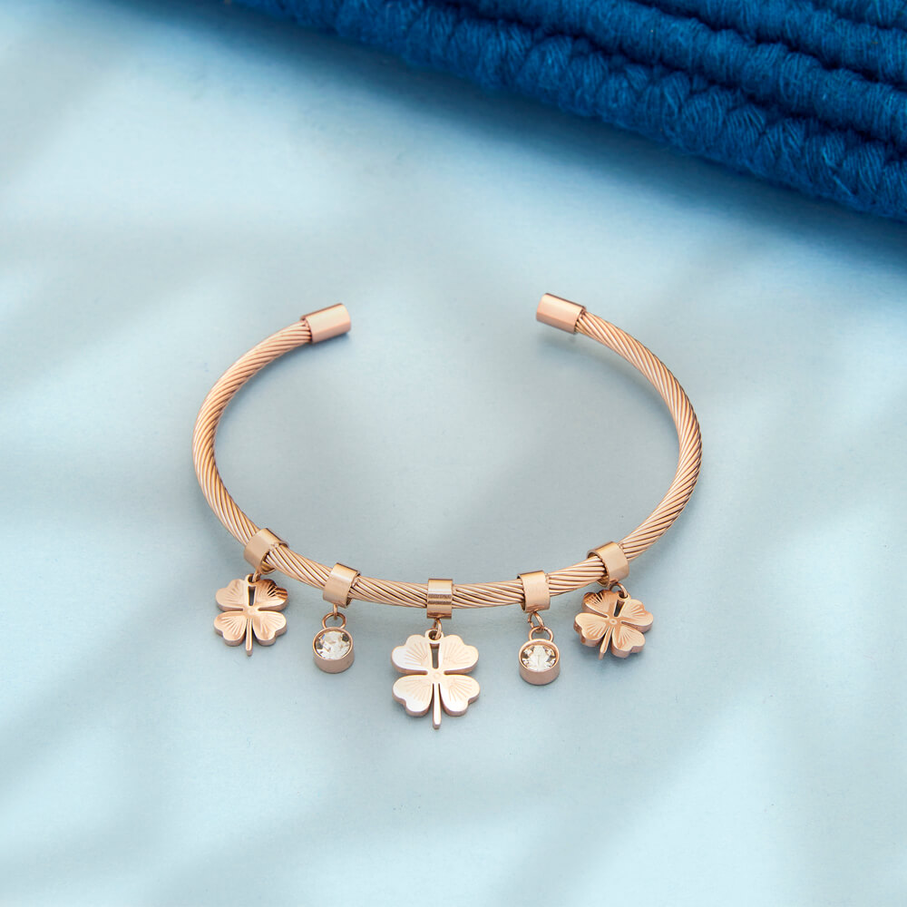 Add a touch of modern elegance to your wrist with this stylish rose gold clover charm kada bracelet. Crafted in an open kada style, it features delicate clover charms and subtle crystal accents that add movement and shine. Comfortable to wear and easy to slip on, this bracelet is perfect for everyday styling as well as gifting