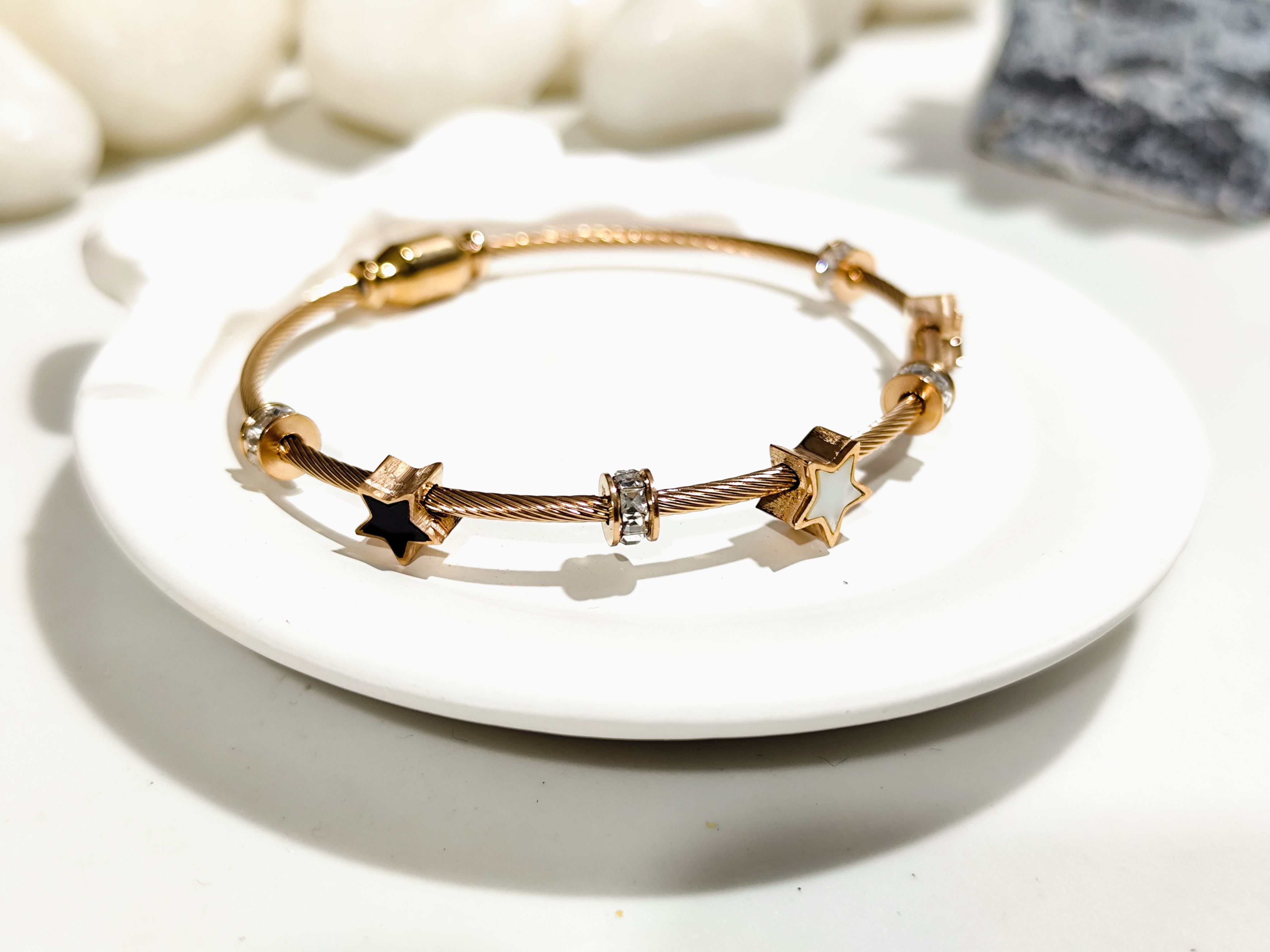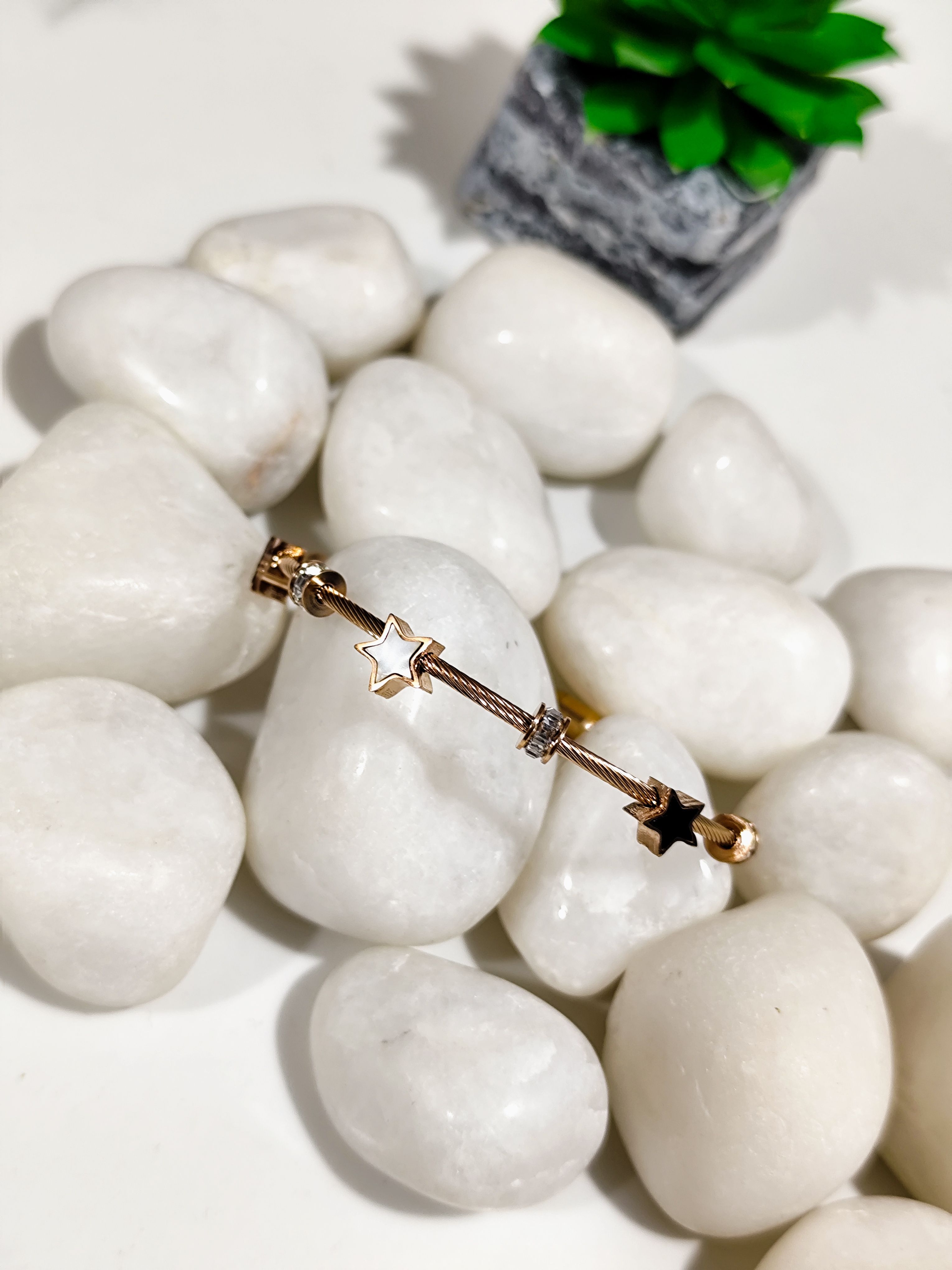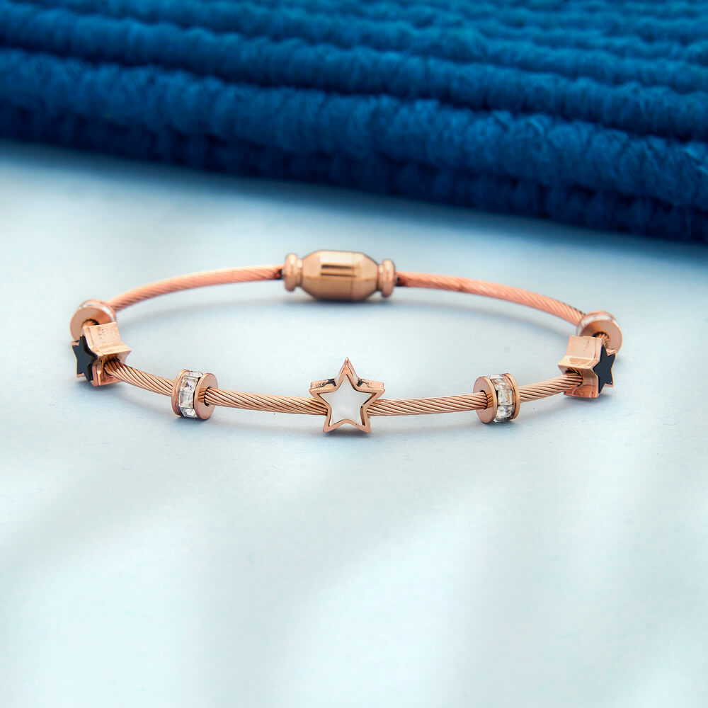 Add a hint of sparkle and modern elegance to your wrist with this beautiful rose gold star charm kada bracelet. Designed in a sleek open kada style, it features a delicate star centrepiece with crystal accents that enhance its refined, contemporary look. Lightweight yet sturdy, this bracelet is easy to wear and perfect for everyday styling or gifting.