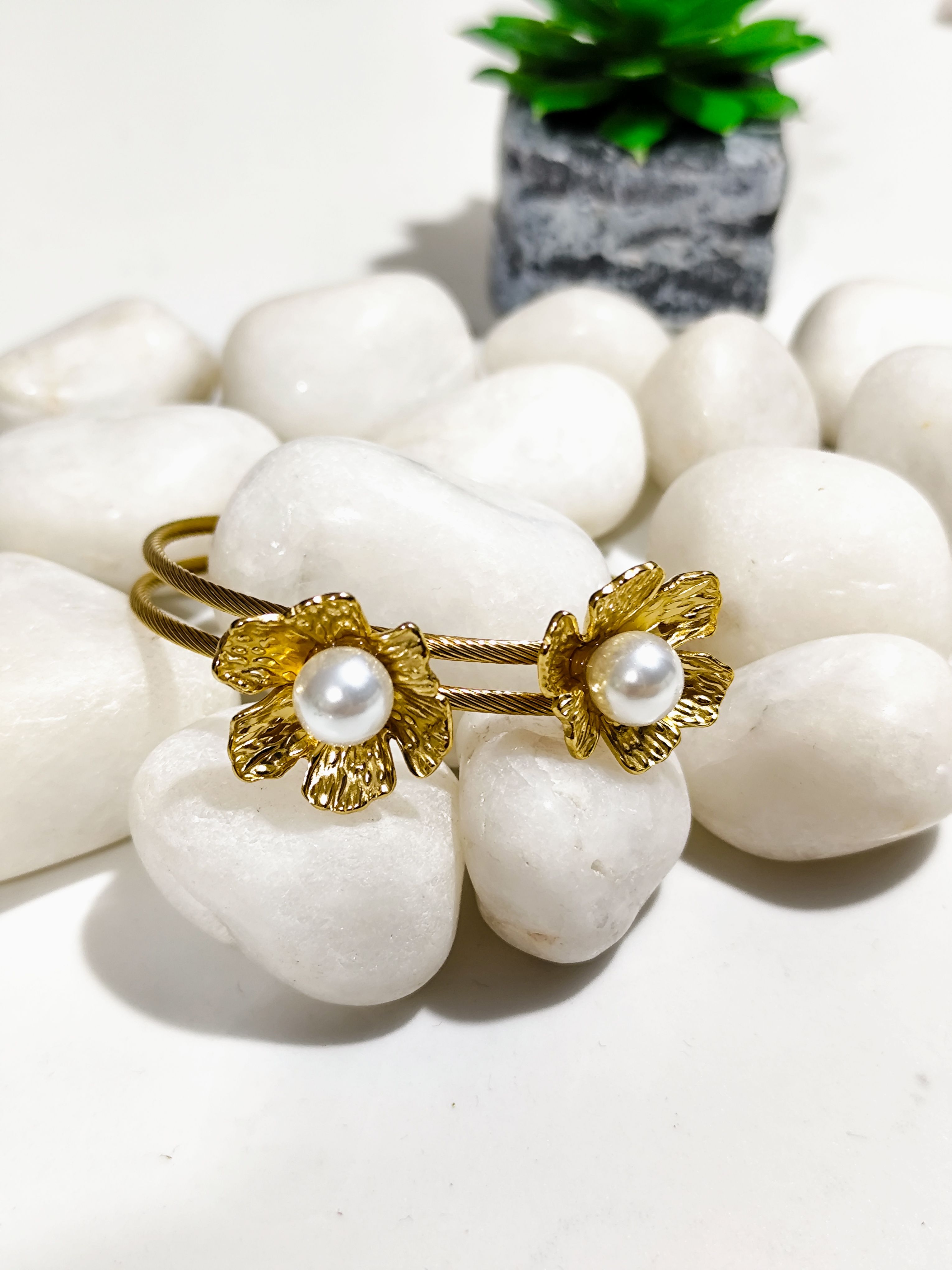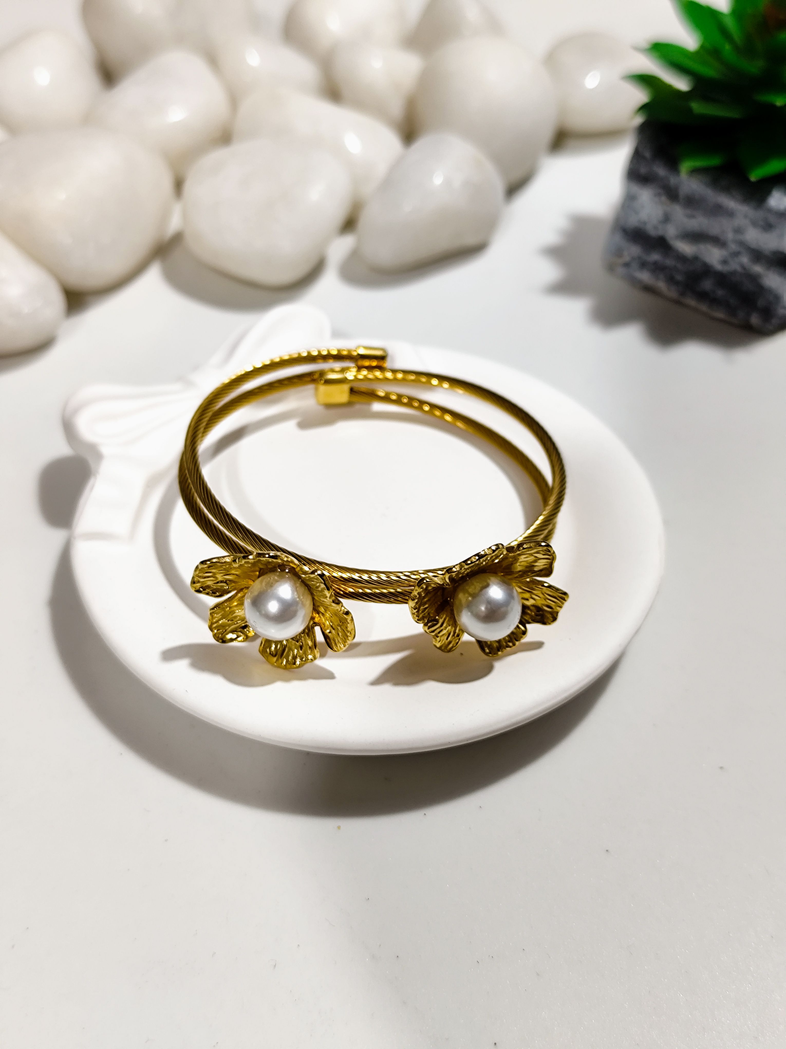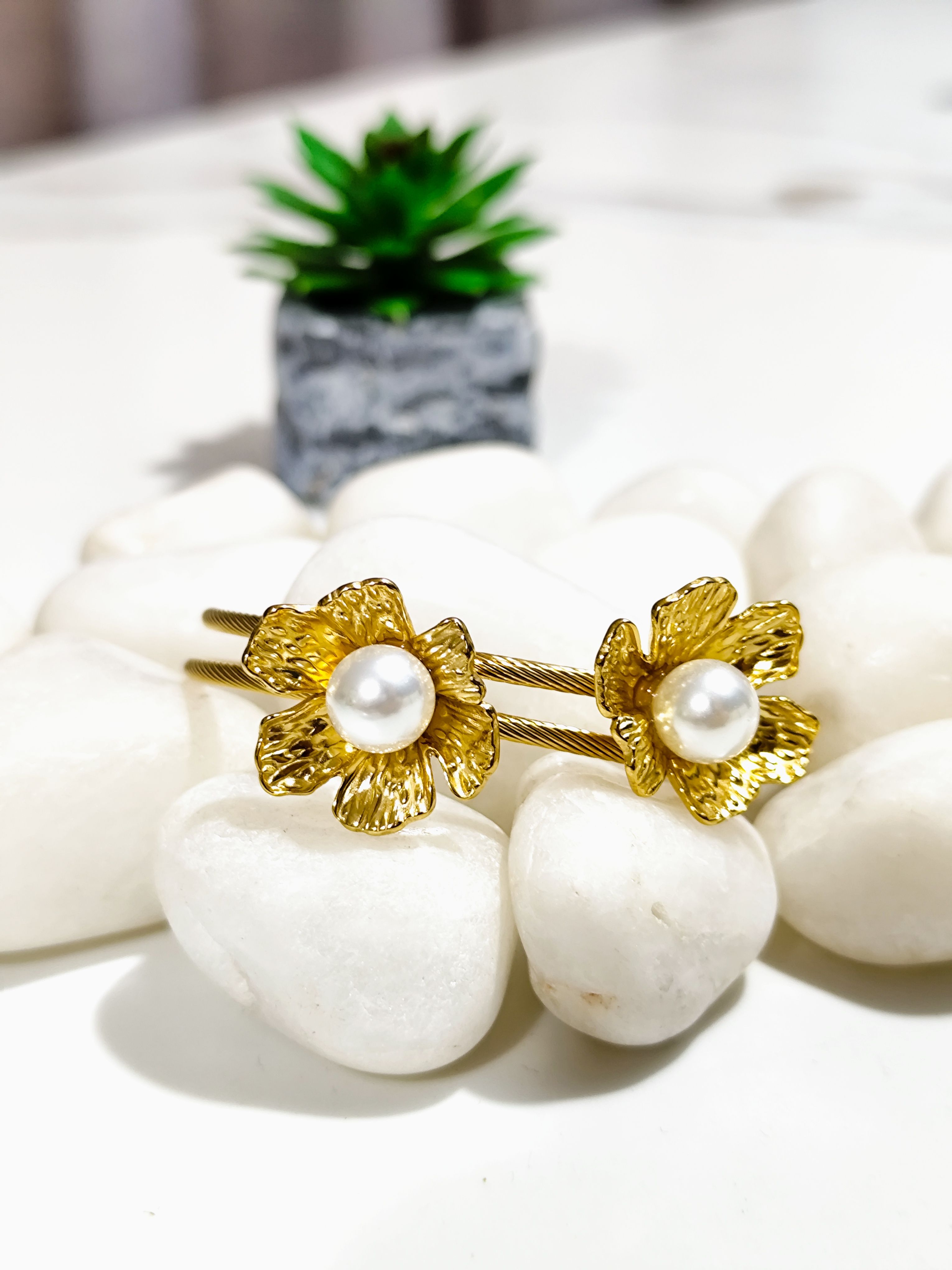 Add timeless elegance to your wrist with this beautiful gold pearl floral kada bracelet. Crafted in an open kada style, it features delicately sculpted floral motifs with lustrous pearl centres that bring a graceful and feminine charm. The textured gold finish paired with pearls makes this bracelet perfect for both everyday elegance and special occasions.