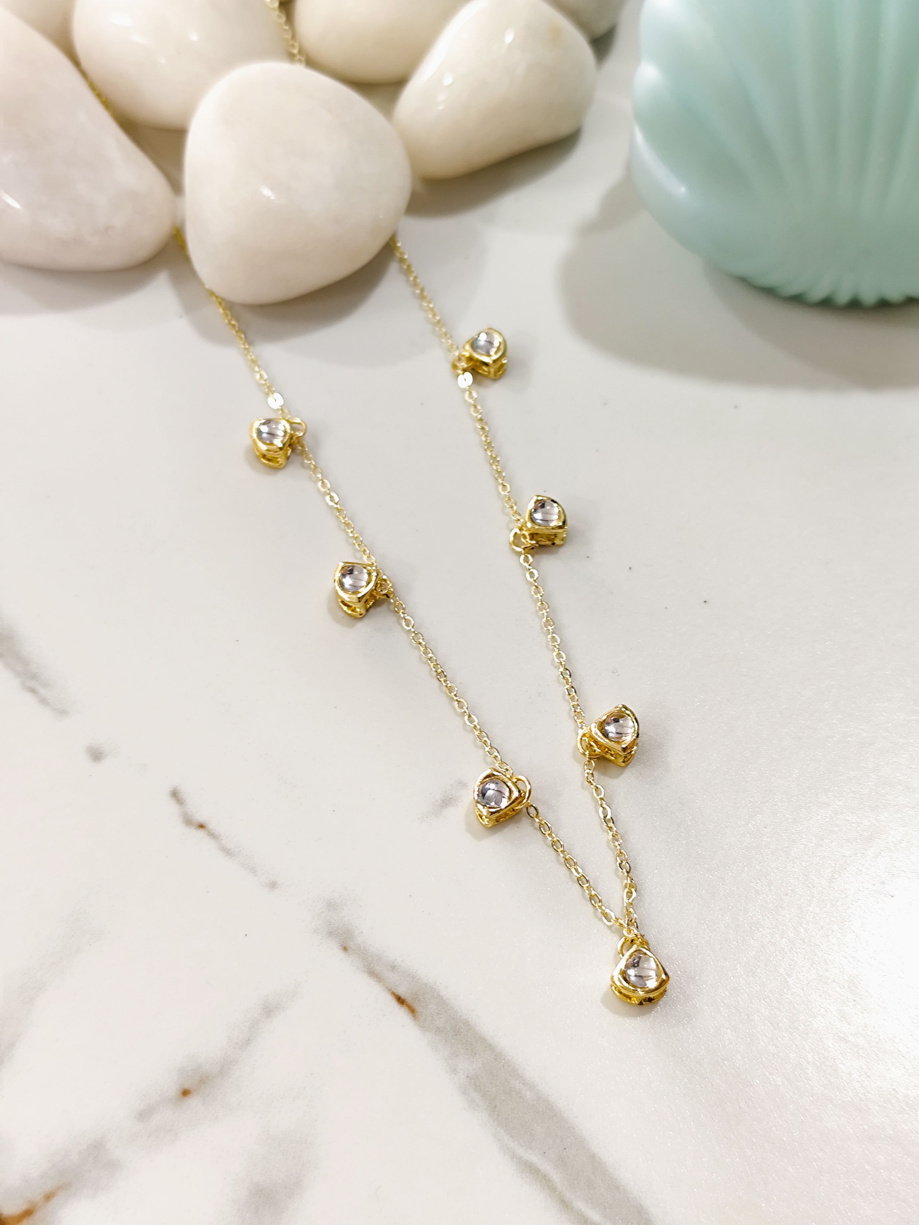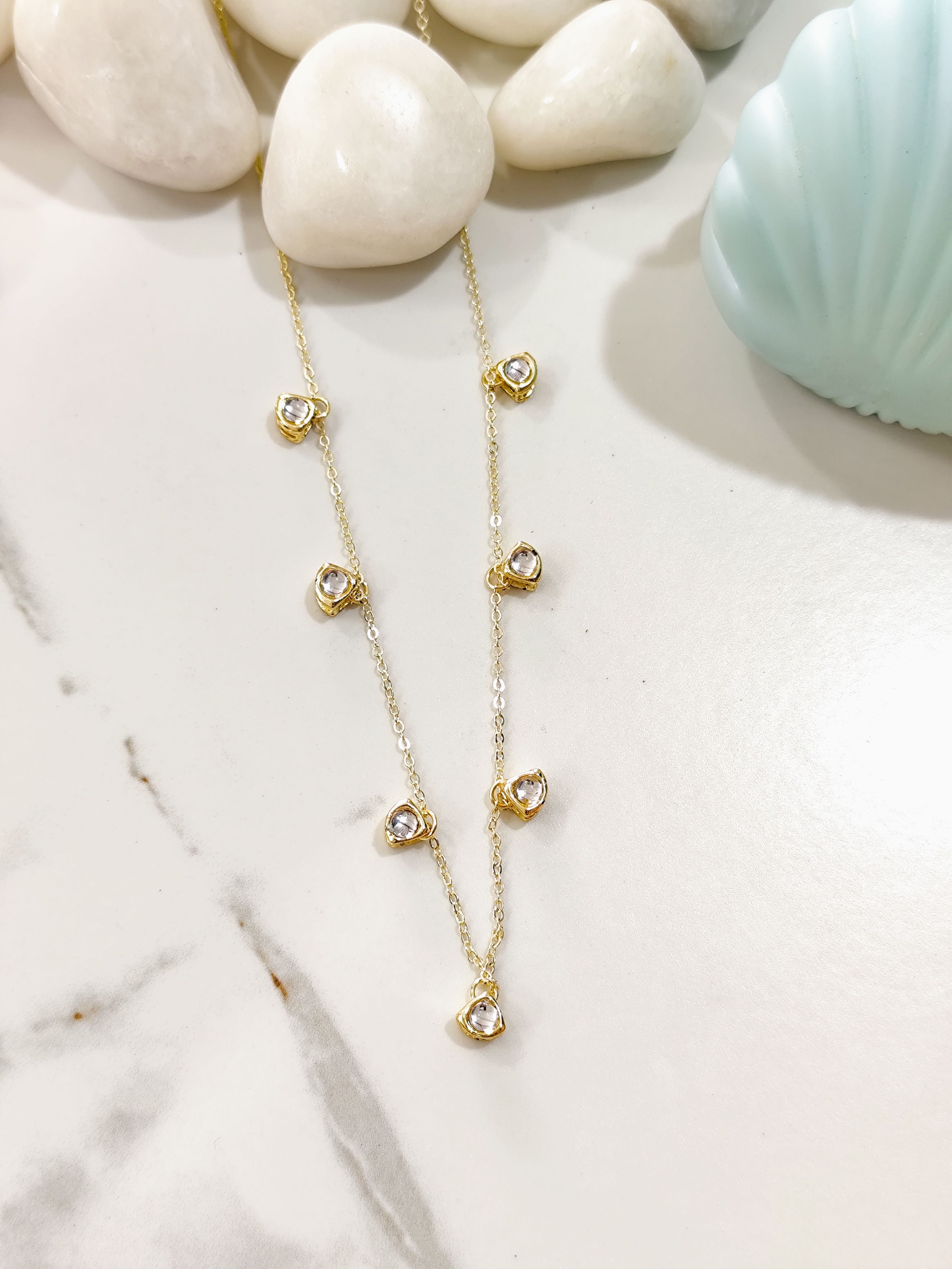 graceful everyday necklace featuring delicate crystal drop accents placed along a fine chain. Subtle sparkle makes it perfect for daily wear or layering with other necklaces.