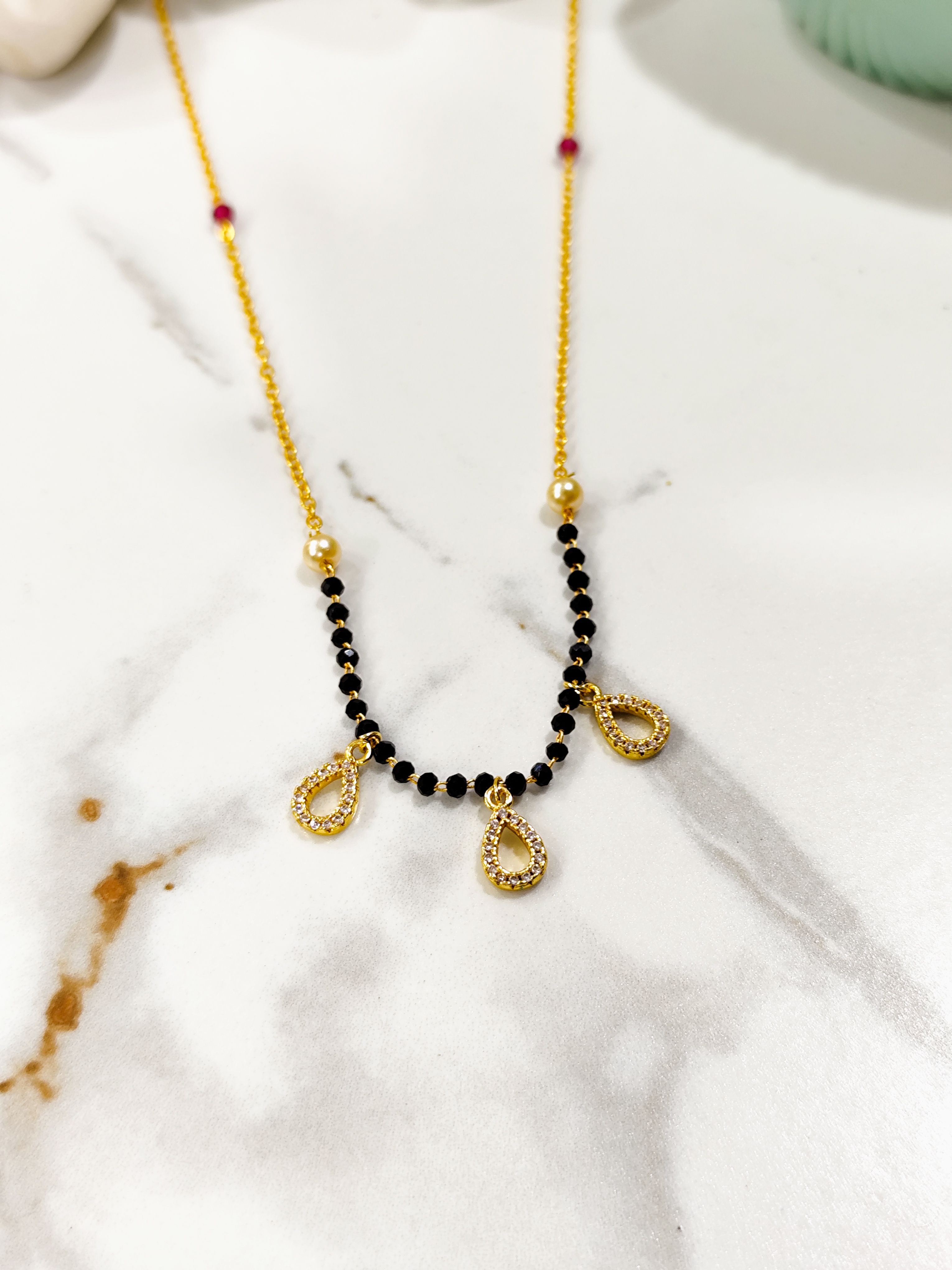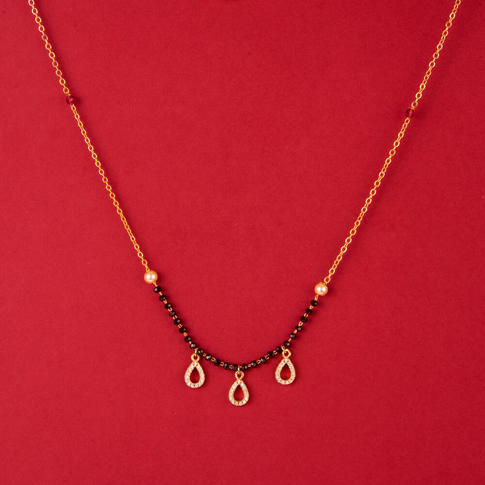modern mangalsutra with delicate teardrop charms that add a soft sparkle. Designed for women who prefer minimal jewellery with a stylish touch.