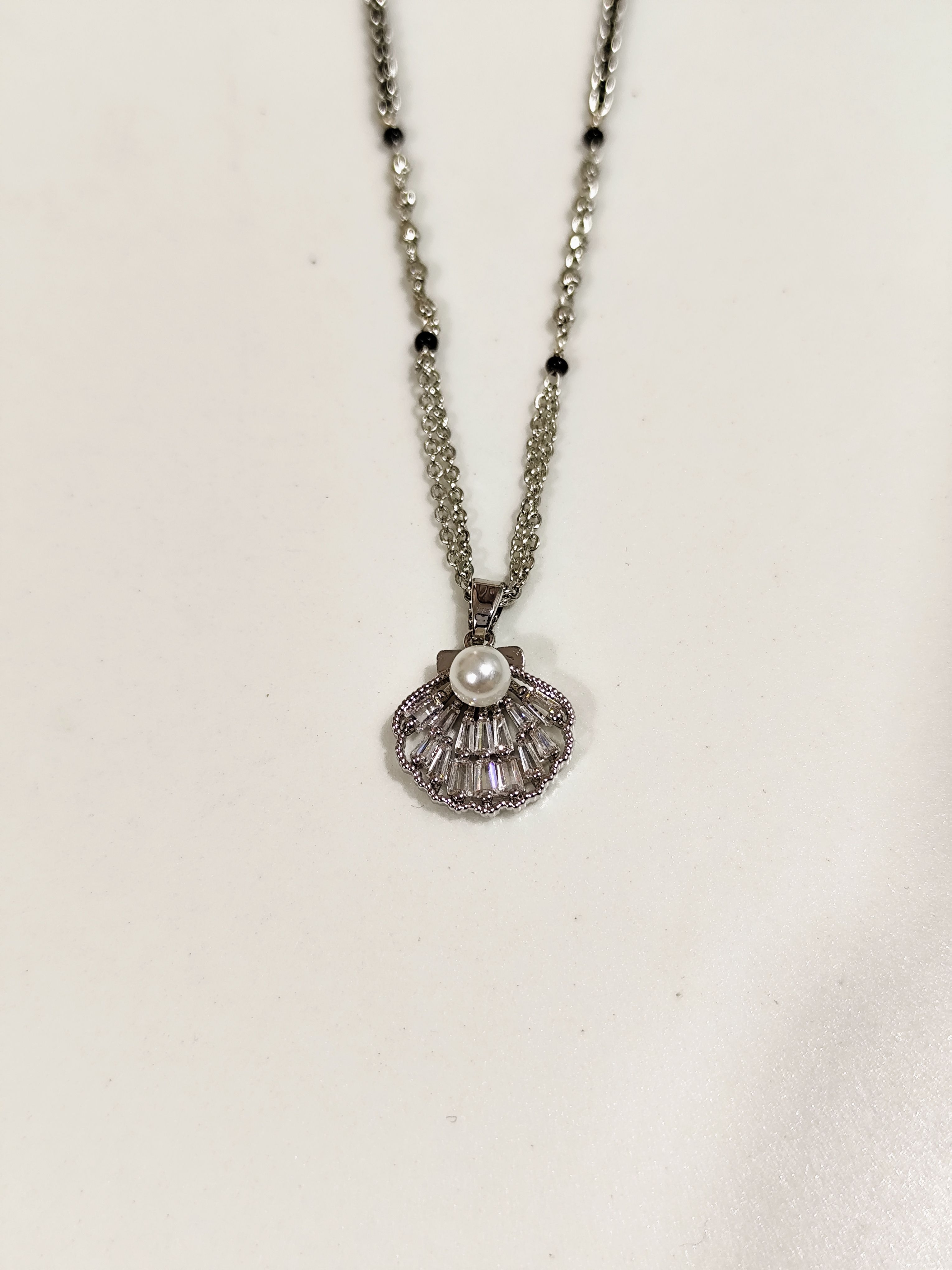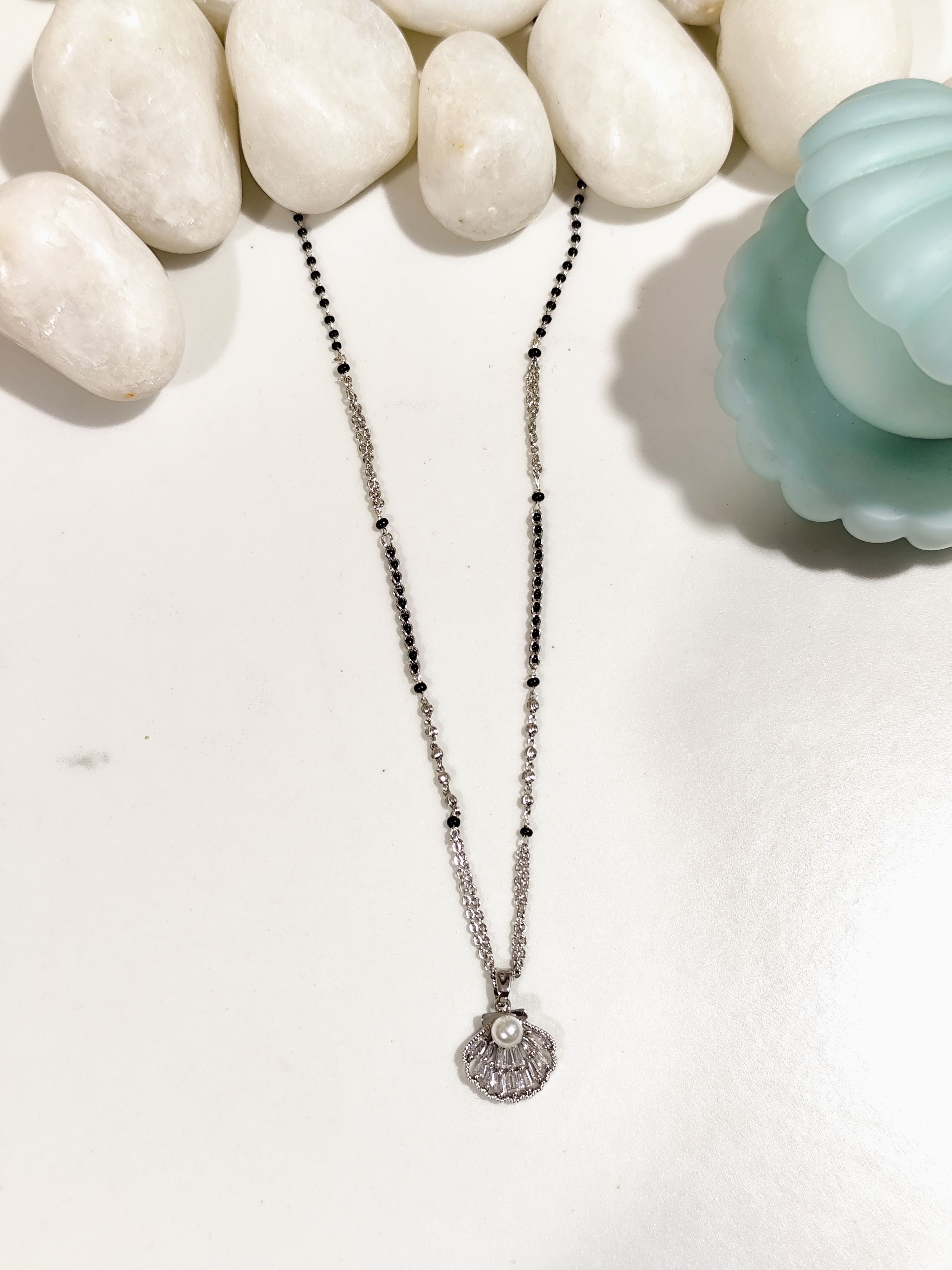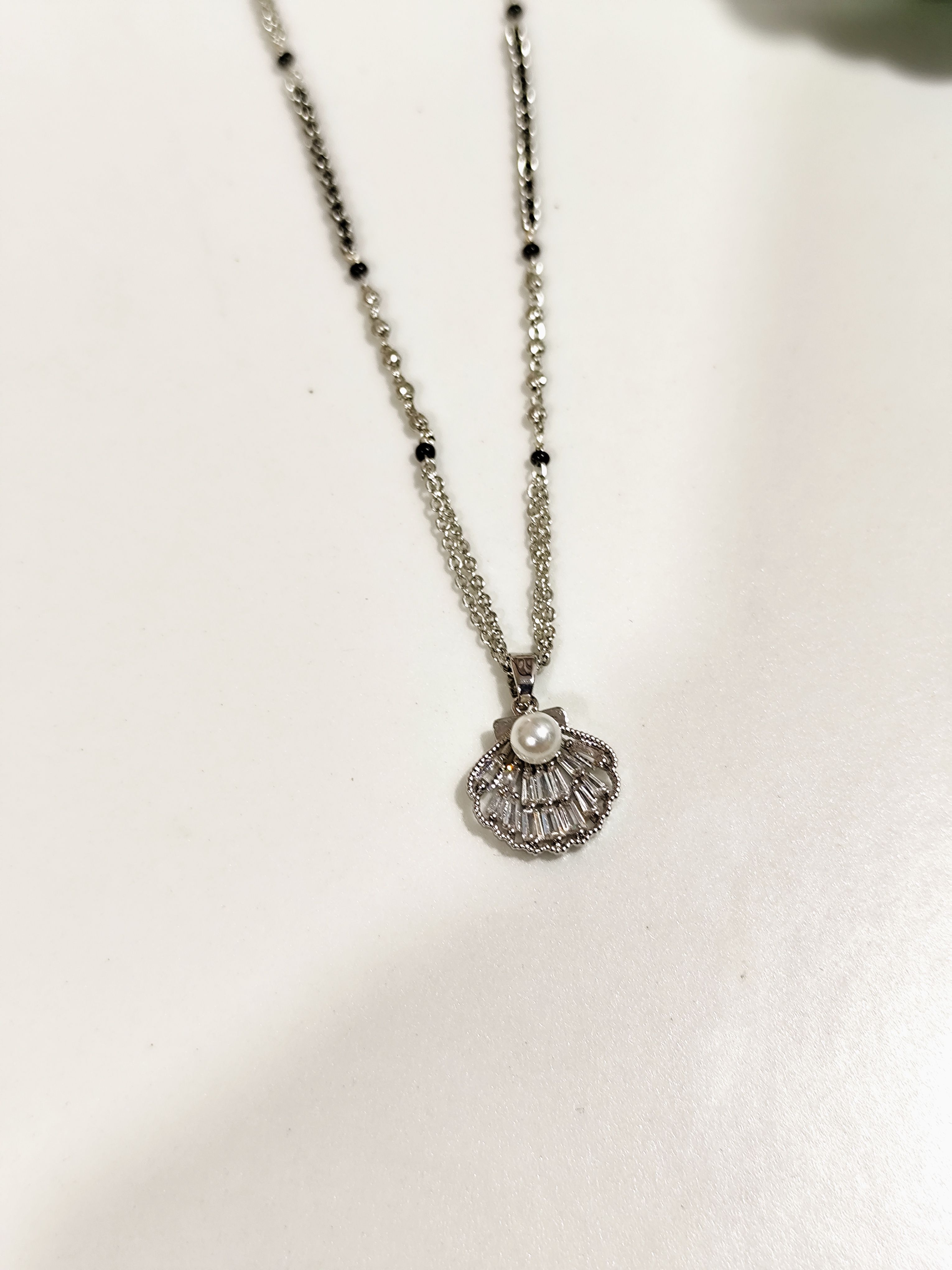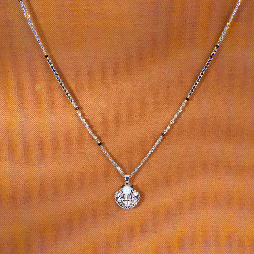 unique mangalsutra with a silver-tone shell-inspired pendant and pearl-style centre. Perfect for women who love contemporary designs with a traditional meaning.