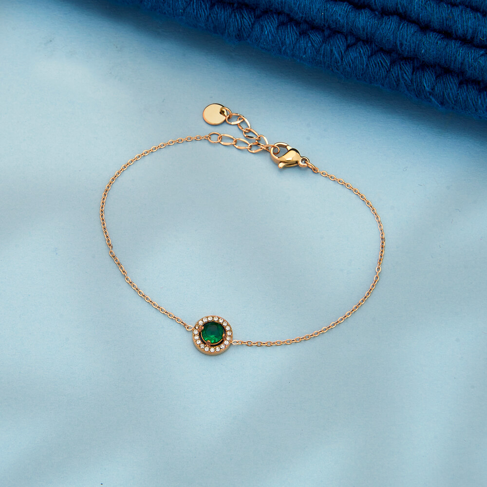 Gracefully designed with a touch of sparkle, the Emerald Halo Charm Bracelet features a deep green center stone surrounded by delicate crystal detailing. Set on a fine gold-tone chain, this bracelet adds a subtle pop of color while keeping the look classy and refined. Perfect for everyday elegance or special occasions, this bracelet pairs beautifully with both ethnic and western outfits. Lightweight and adjustable, it’s an effortless addition to your jewellery collection.