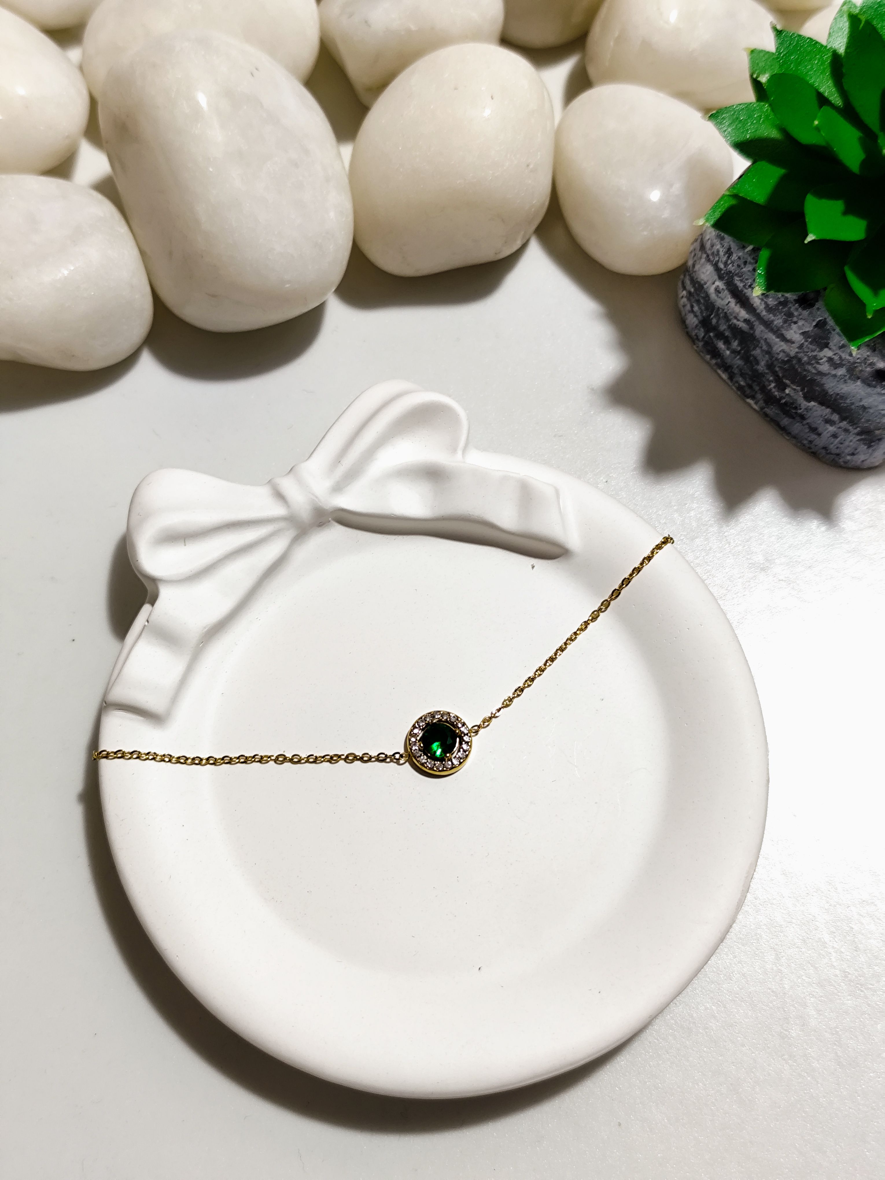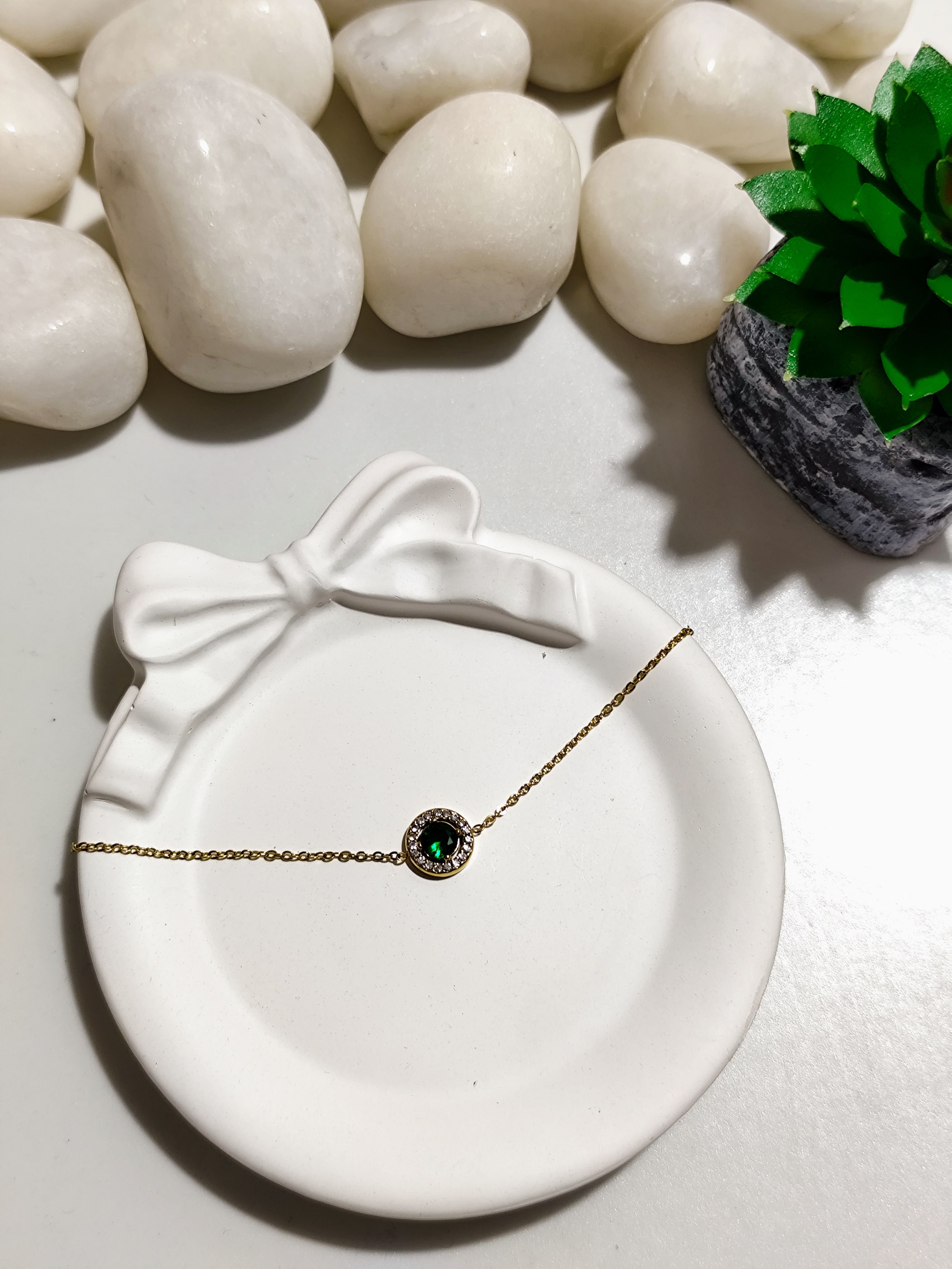 • Design: Gold-tone chain with emerald green halo charm