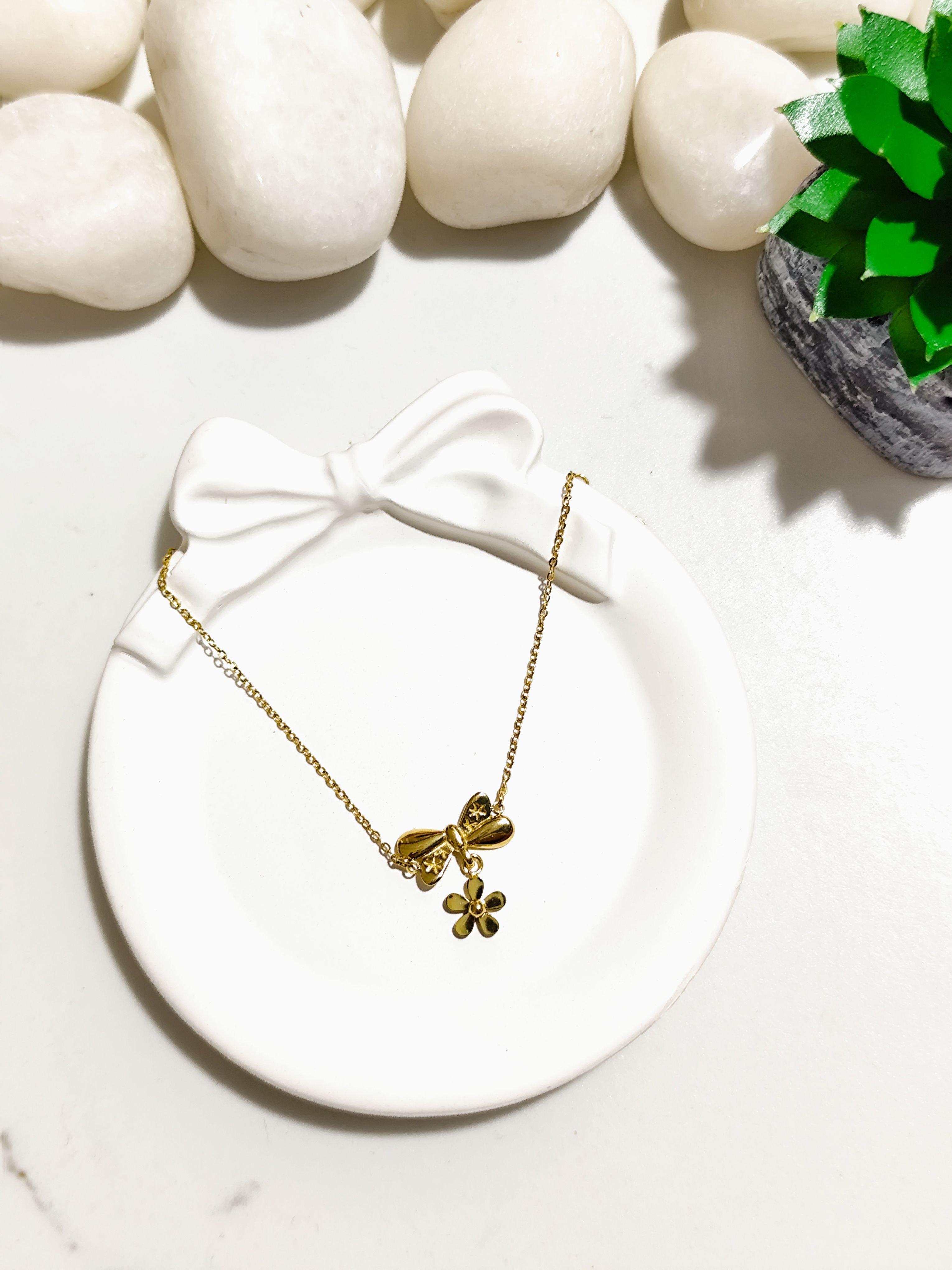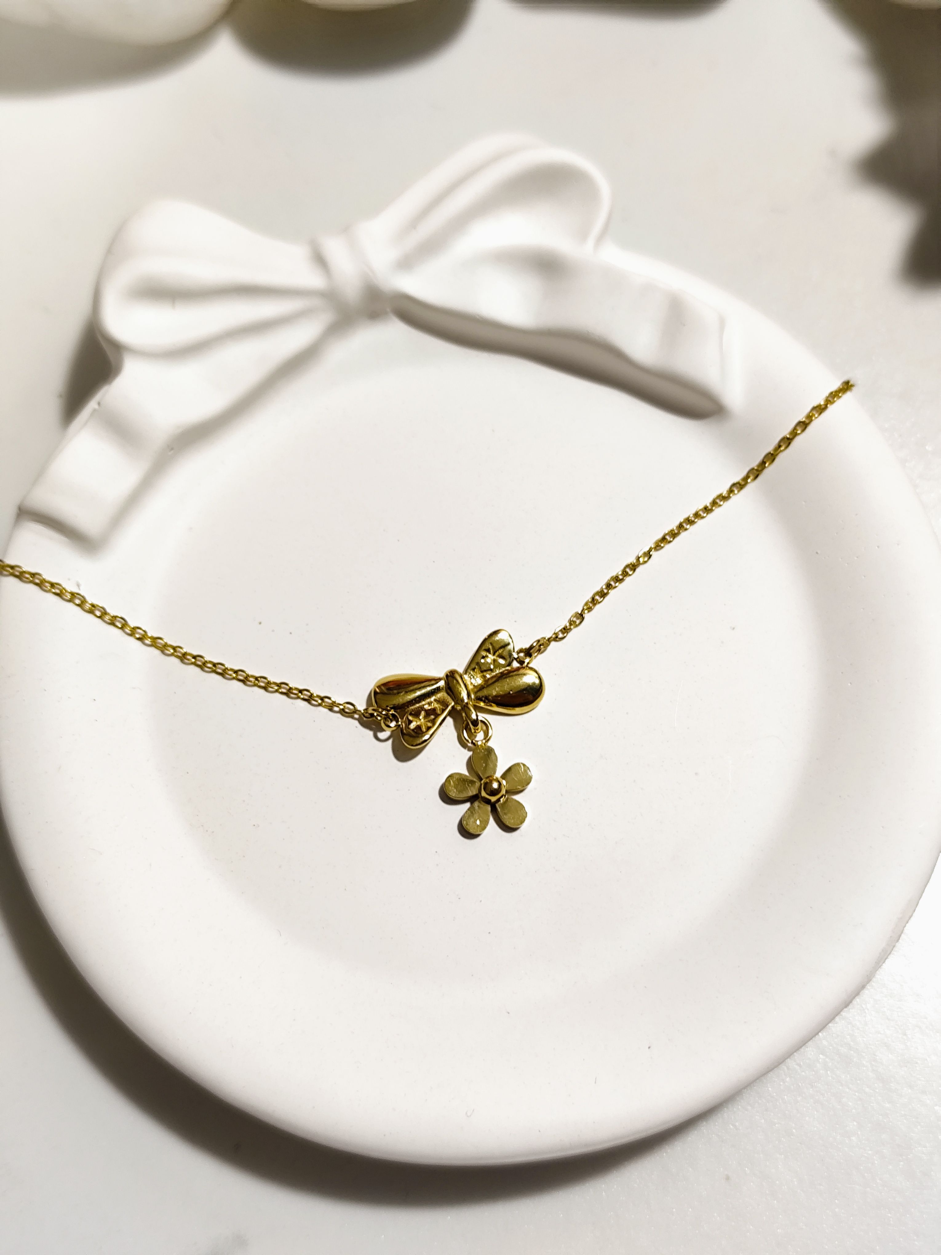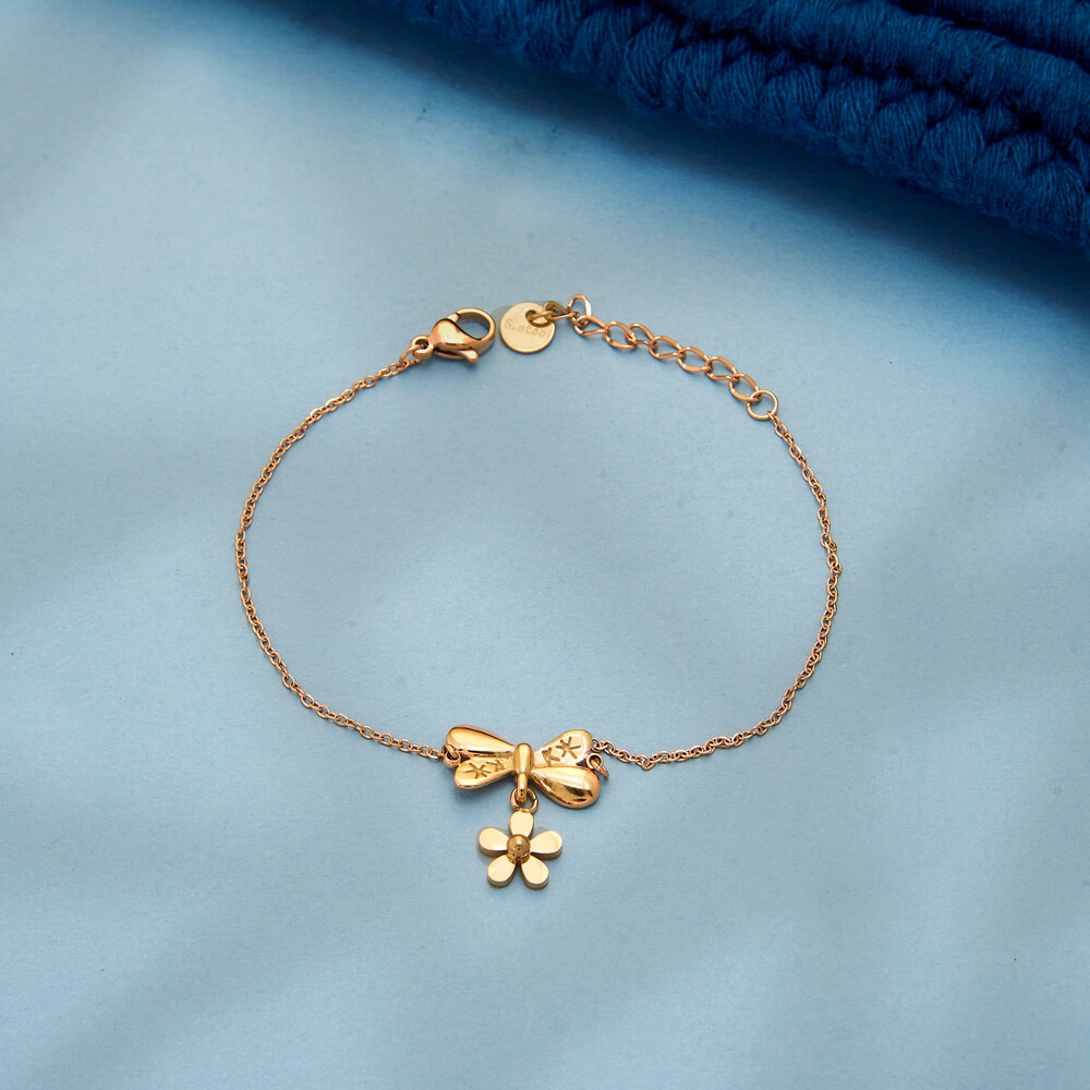 Sweet, delicate, and timeless — the Golden Bow Blossom Bracelet features a dainty bow charm paired with a minimal floral drop, crafted on a fine gold-tone chain. Designed for those who love subtle details, this bracelet adds a graceful touch to your everyday look. Lightweight and elegant, it’s perfect for daily wear, casual outings, or thoughtful gifting.