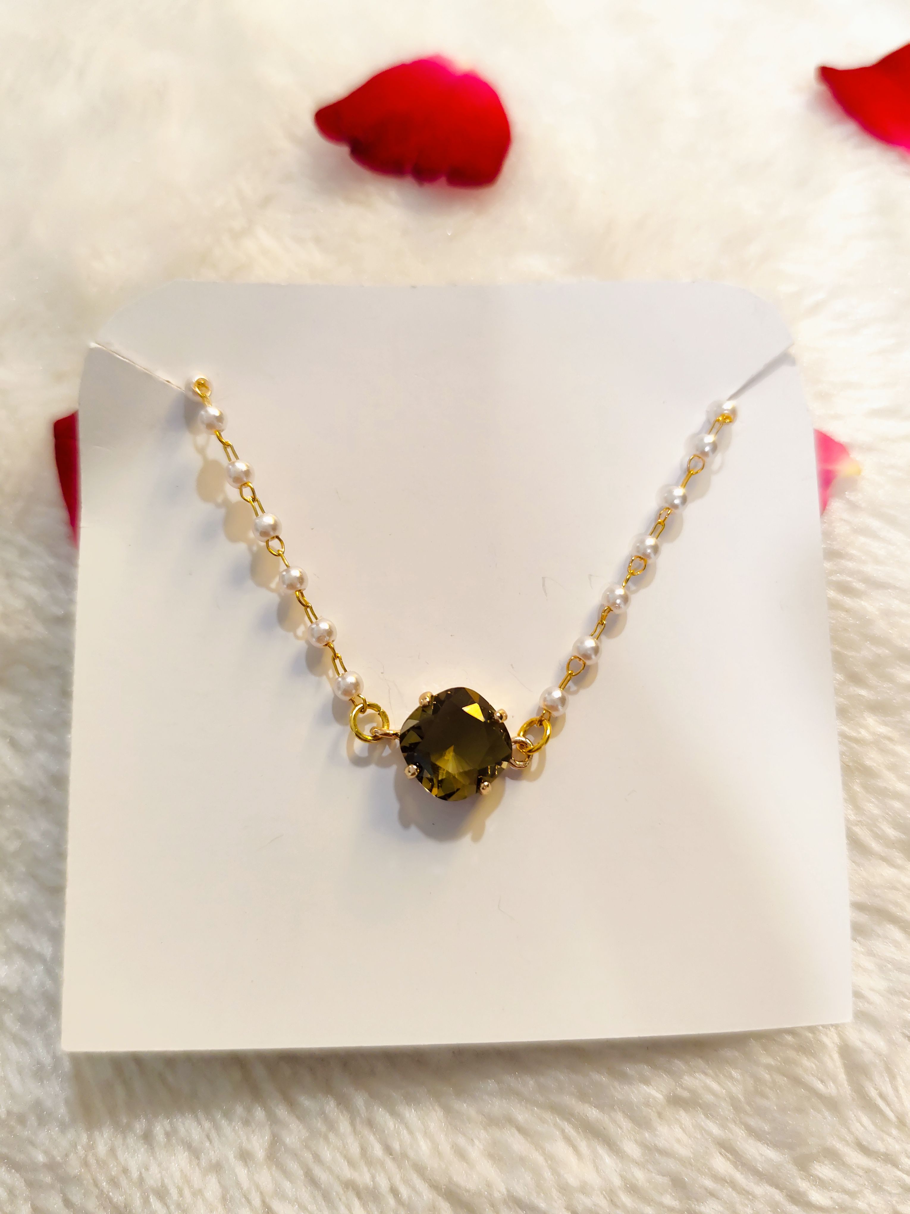 • Design: Gold-tone chain with pearl accents and olive stone charm
