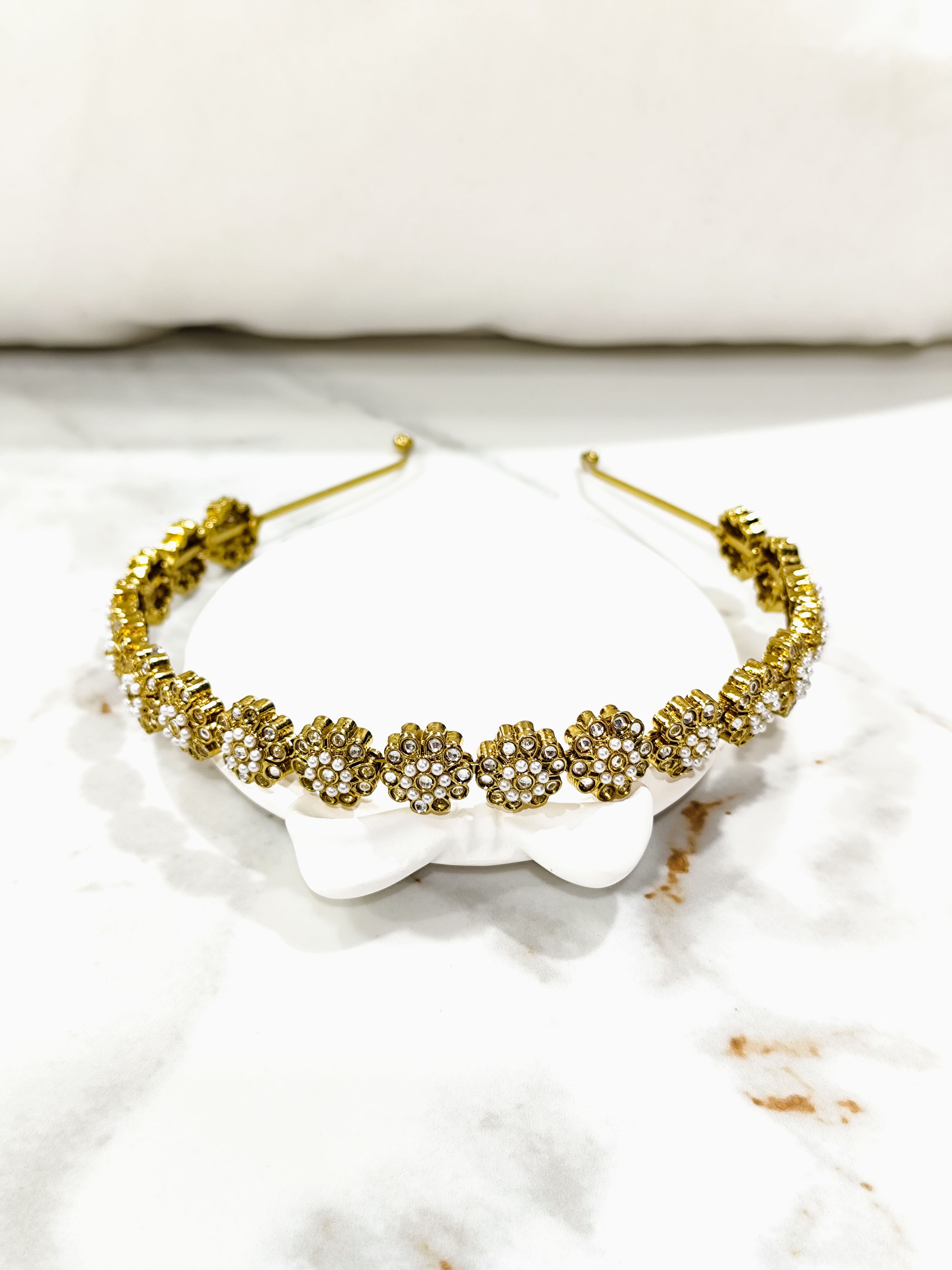 Add a touch of royal elegance to your hairstyle with the Floral Pearl Kundan Hair Band. Designed with intricately detailed floral motifs, pearl accents, and kundan-style stones, this hair band instantly elevates any festive or traditional look. Perfect for weddings, festivals, parties, and special occasions, this statement hair accessory pairs beautifully with ethnic outfits and adds a graceful finishing touch to your overall look.