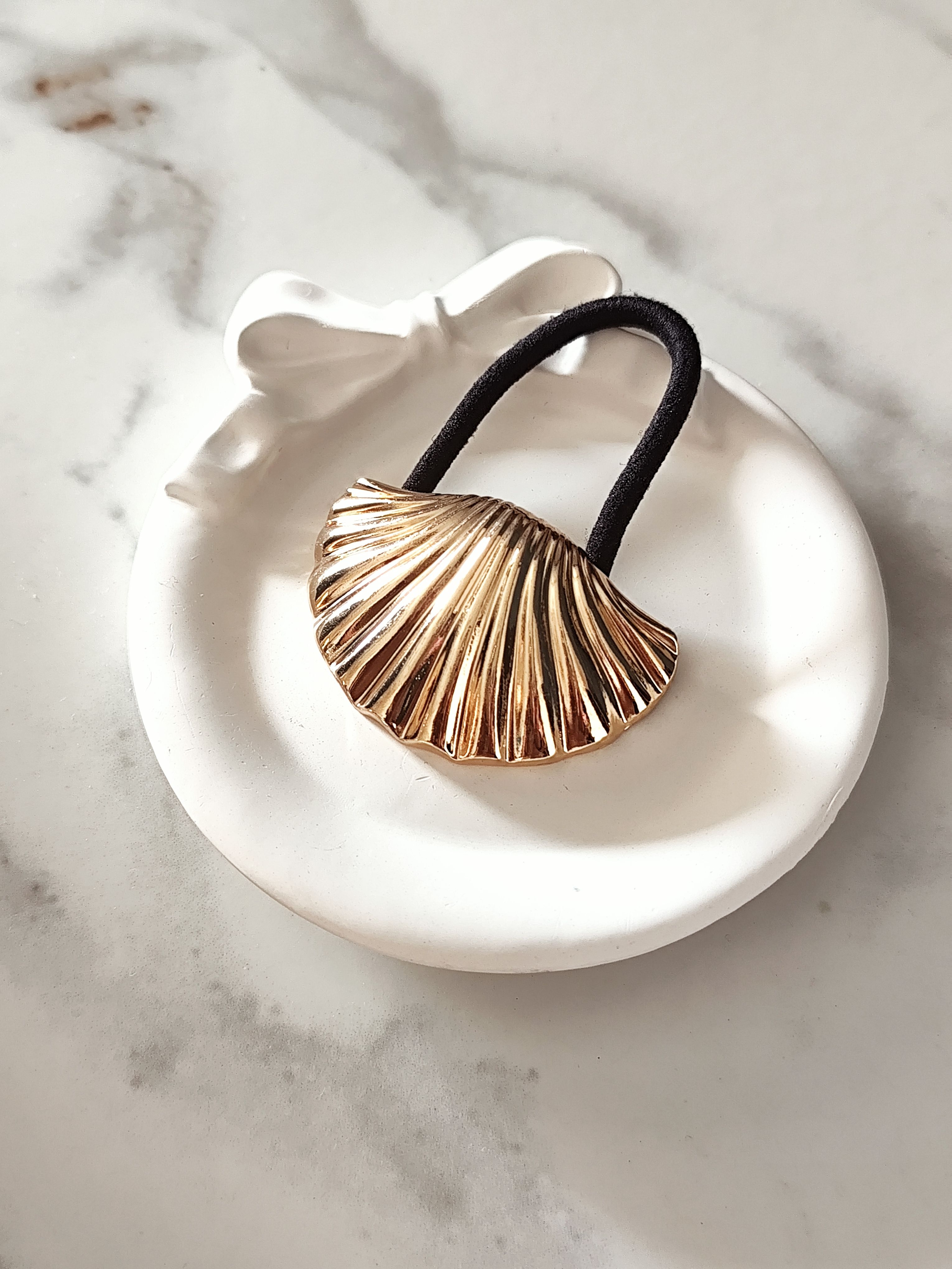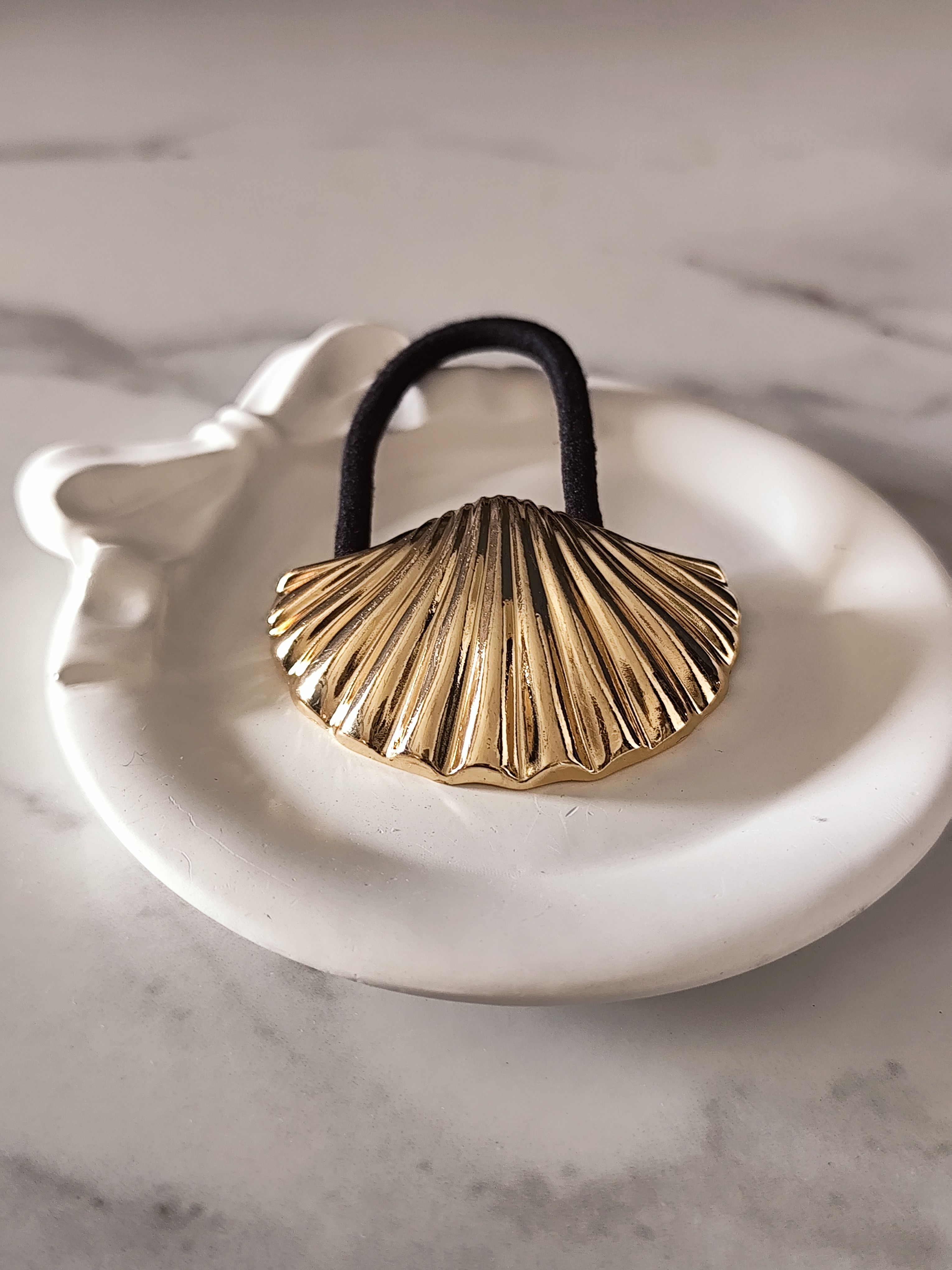 Inspired by ocean elements, this gold shell hair rubber band adds a soft luxe touch to everyday hairstyles. The sculpted shell design paired with a comfortable black elastic makes it perfect for chic ponytails and buns.